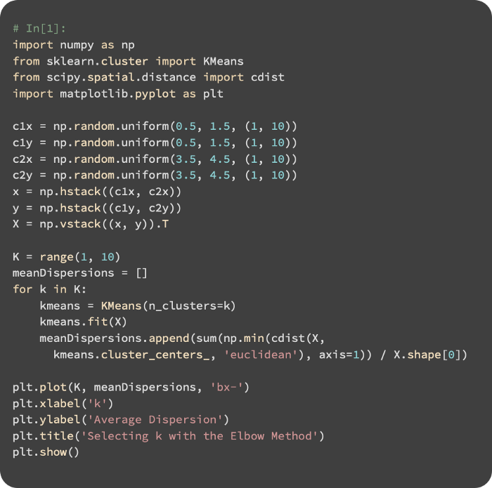 As k increases from 1 to 2, the average dispersion improves rapidly. For values of k greater than 2, there is little improvement. In this example, we will apply the elbow method to a dataset with three clusters: