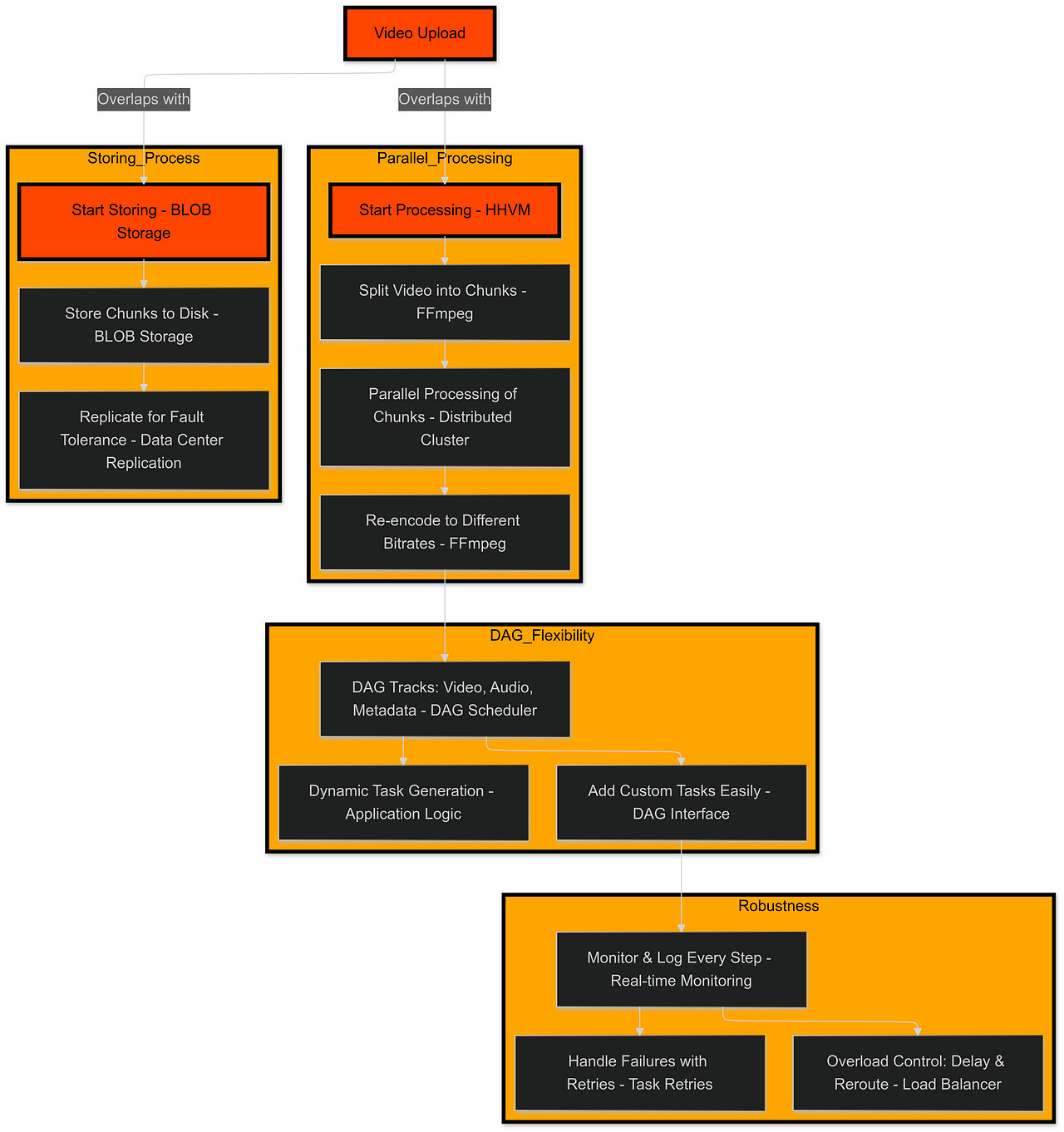 Facebook recognized these challenges and developed a new framework to meet platform demands. As well as being faster, this new system had to be flexible and reliable. For global video uploads, it needed robust fault tolerance mechanisms, parallel processing to reduce latency, and a programmable interface to allow easy customization.