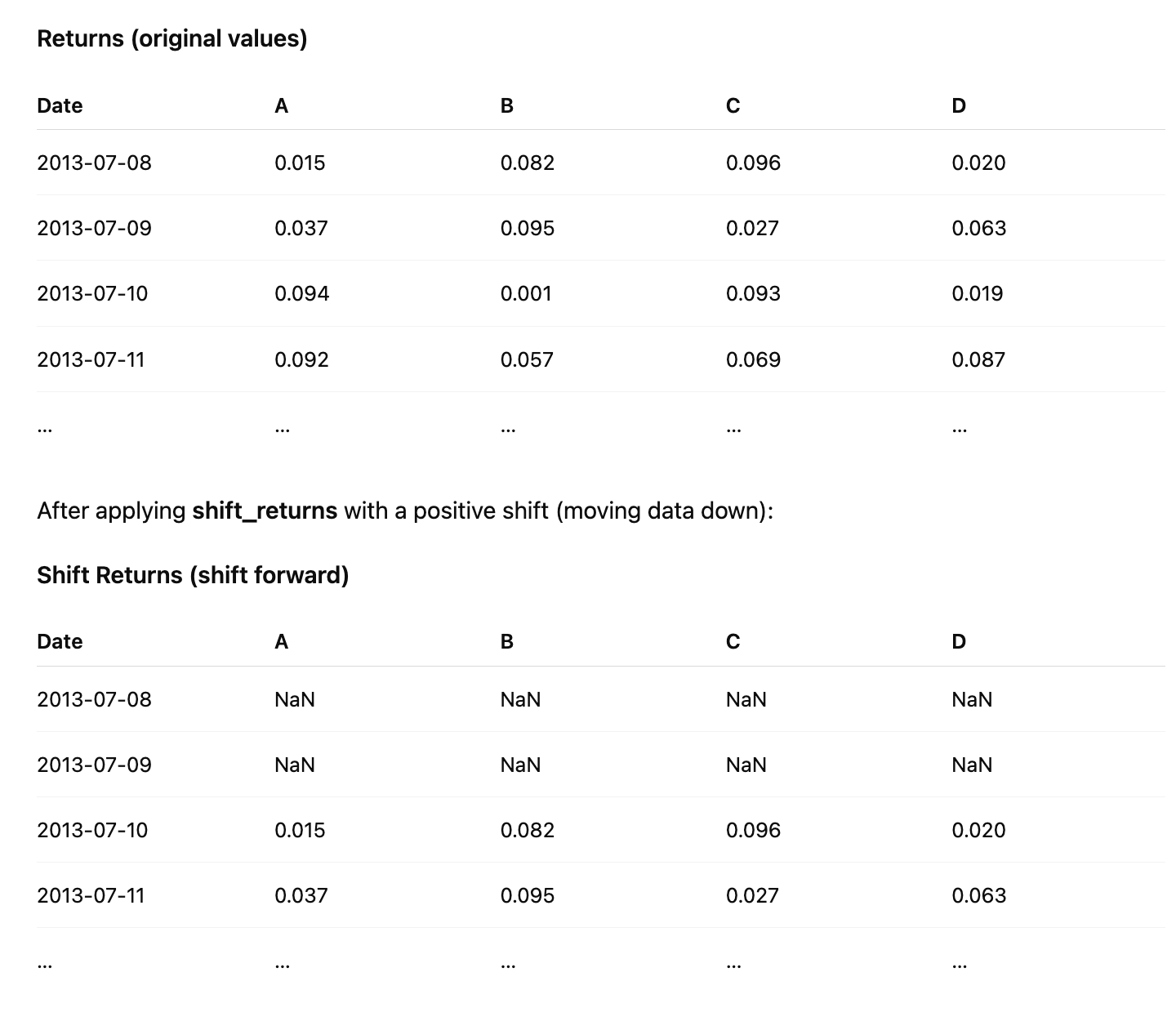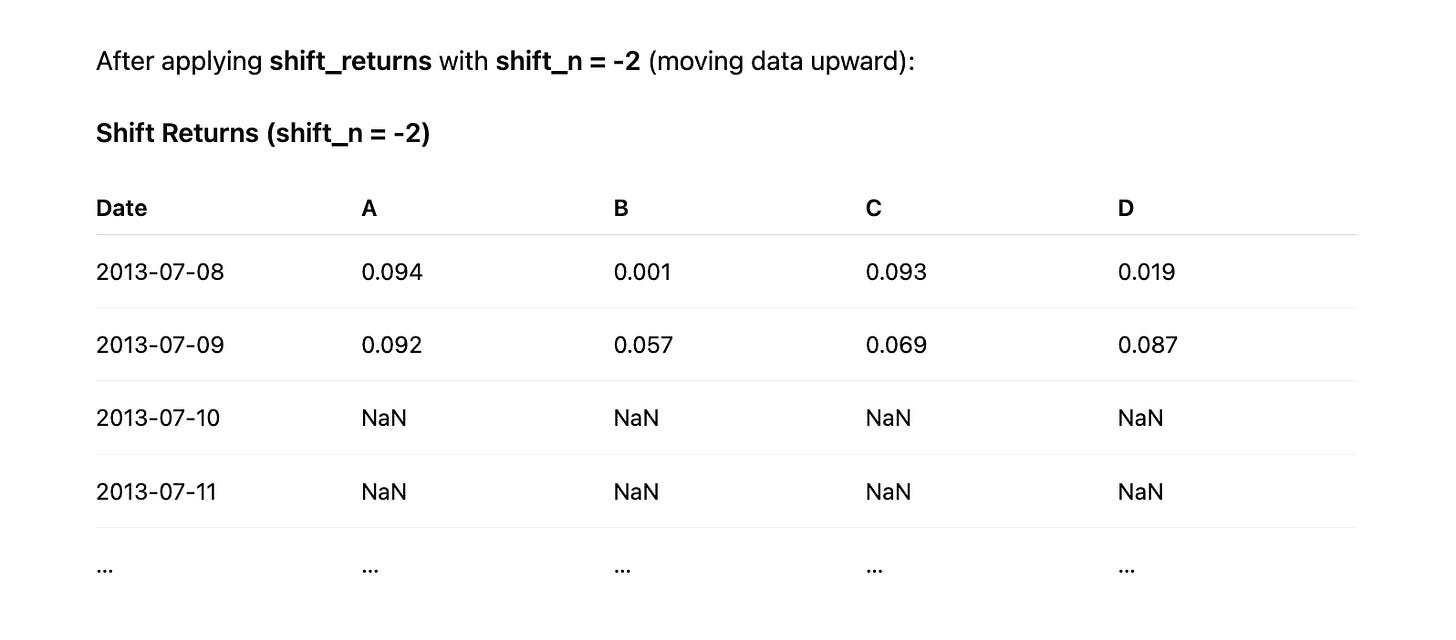 Implement the shift_returns function to shift log returns forward or backward in the time series. For example, with shift_n = 2 and the following returns data: