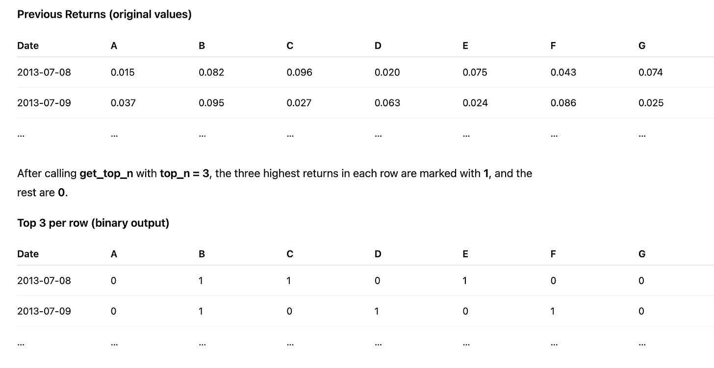Next, the code applies a helper function, get_top_n, to extract the top 50 entries from the original previous returns, forming the long_selection. This step identifies stocks with the highest past returns, as momentum trading posits that these winners are likely to continue outperforming due to sustained investor interest and market inertia. Similarly, get_top_n is called on the inverted returns to produce the short_selection, which effectively captures the 50 stocks with the most negative original returns; by leveraging the inversion, the function ranks the biggest losers as “top” in the modified dataset, aligning with the strategy’s goal of shorting assets expected to decline further based on recent downward momentum.