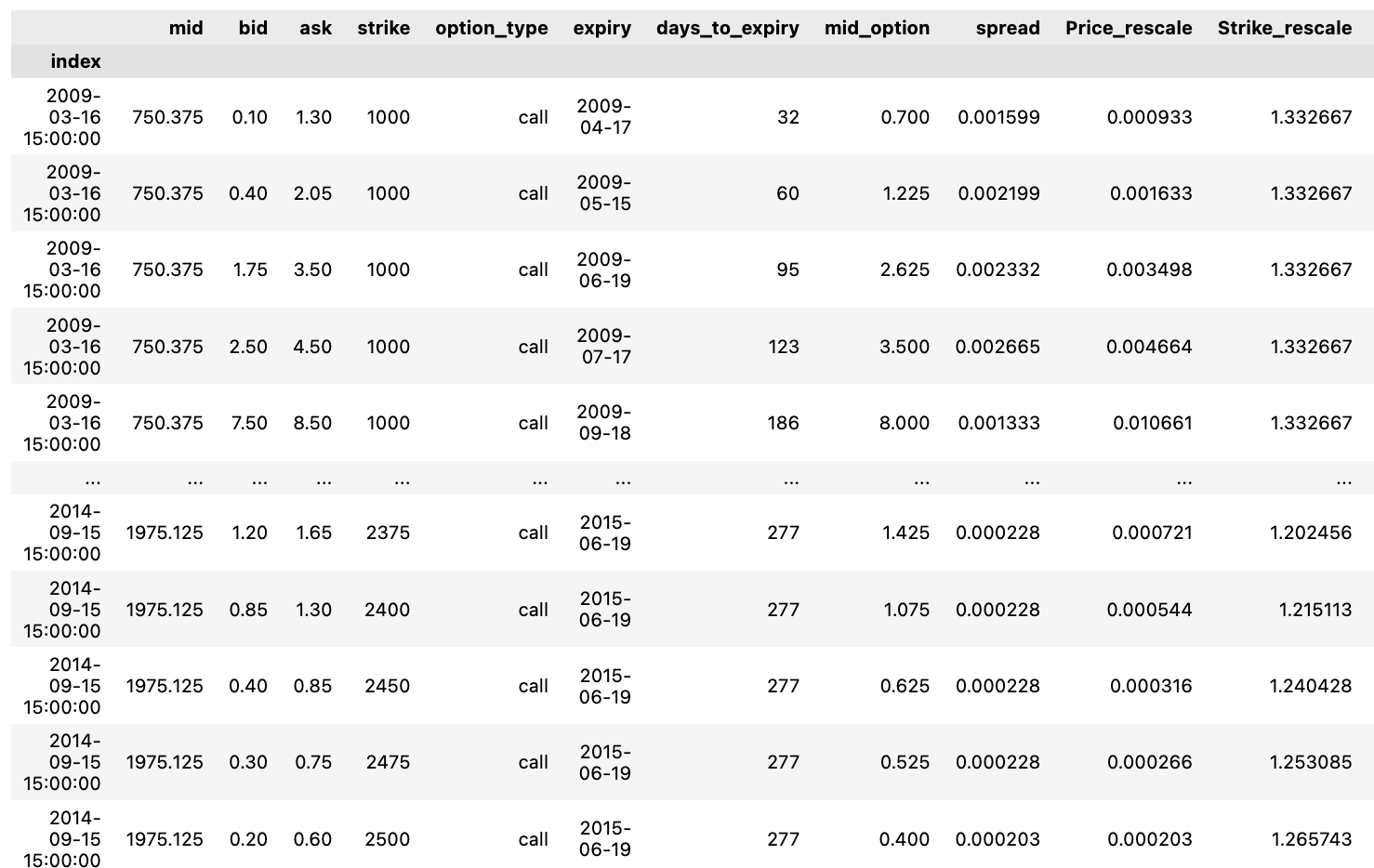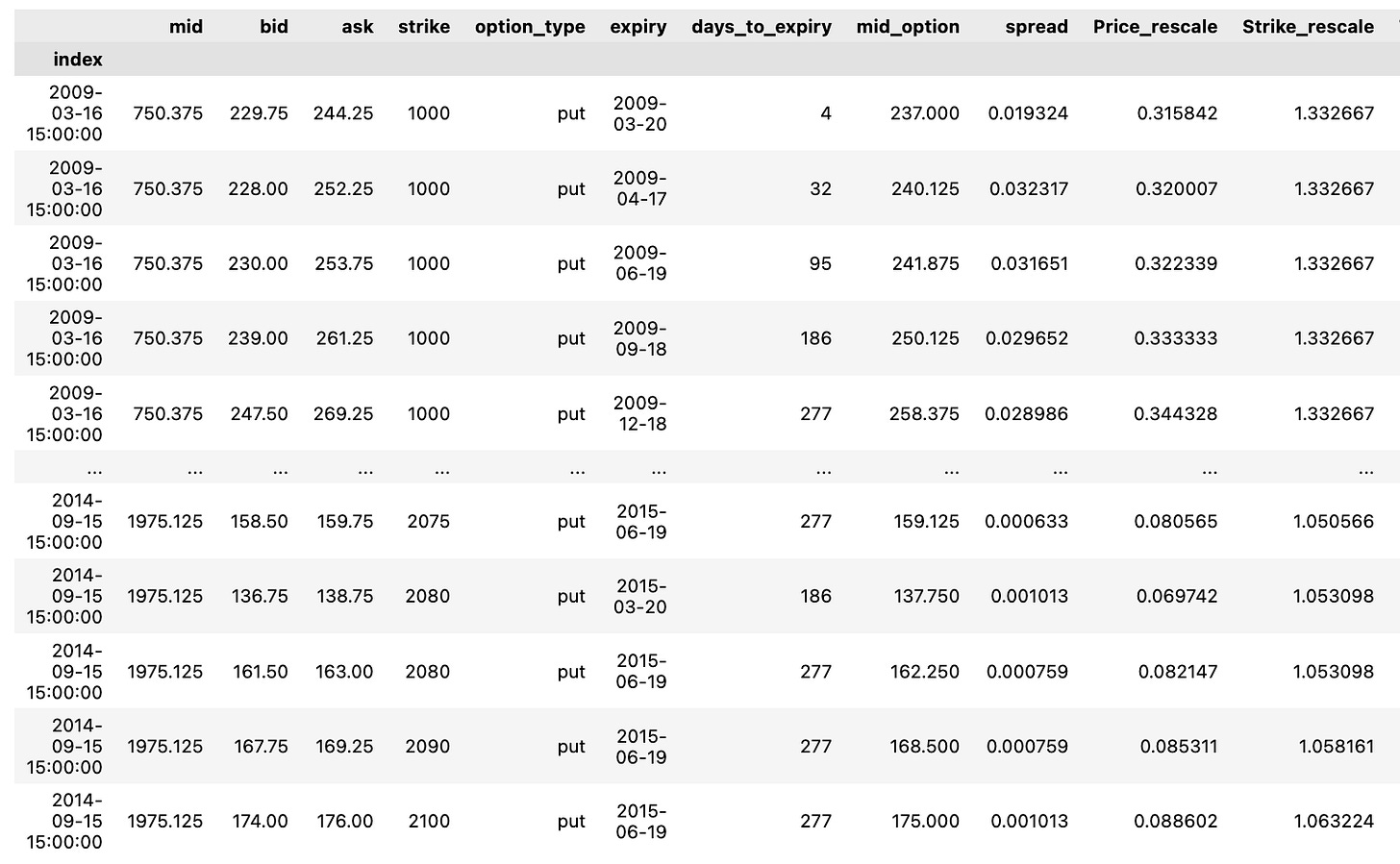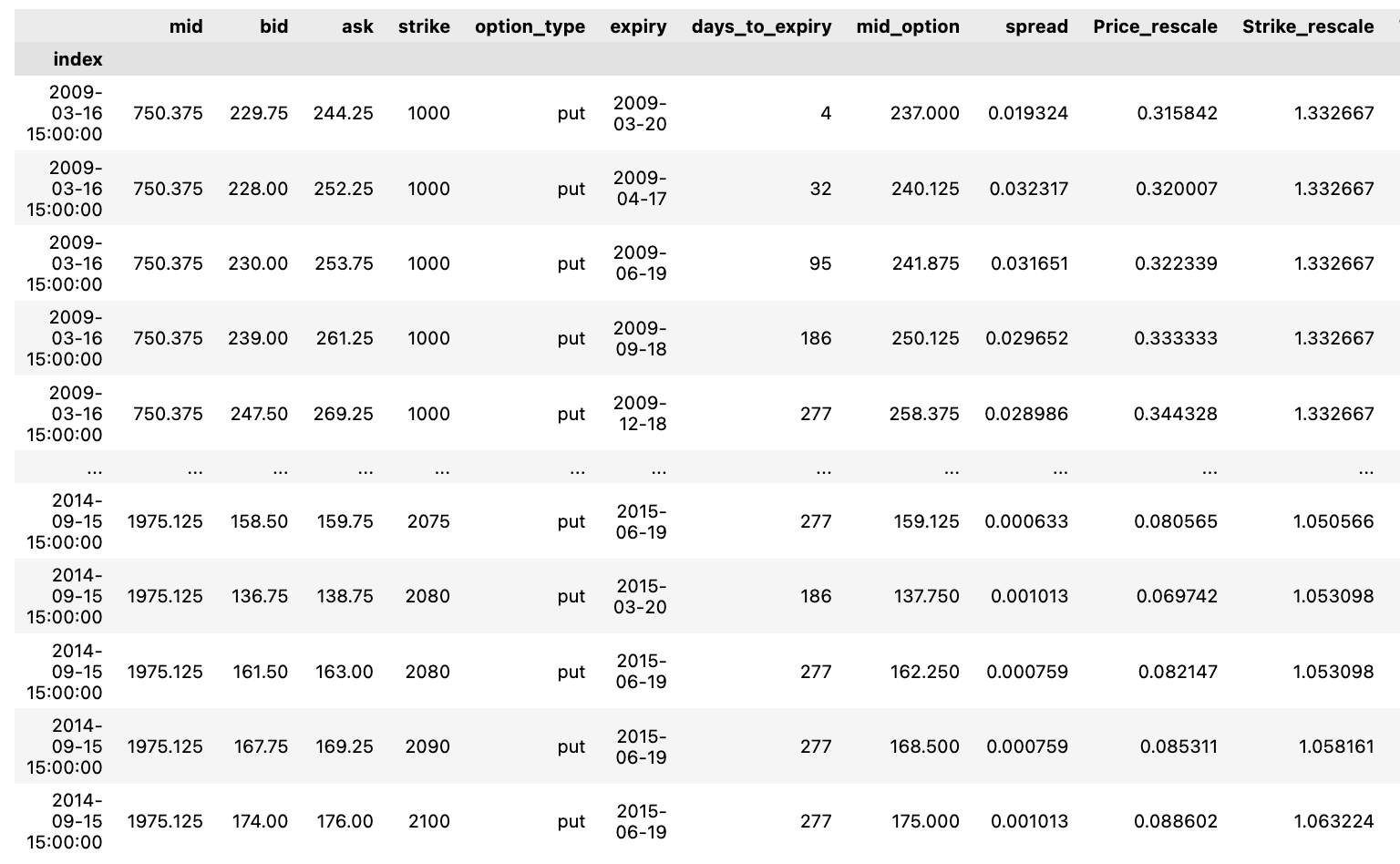 DF = pd.read_csv('/content/drive/MyDrive/Centrale Supelec/DeepLearningFinance/TD8/TP8_ES_options.csv.gz',compression='gzip',index_col=0)