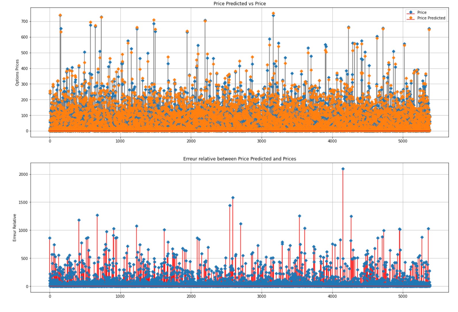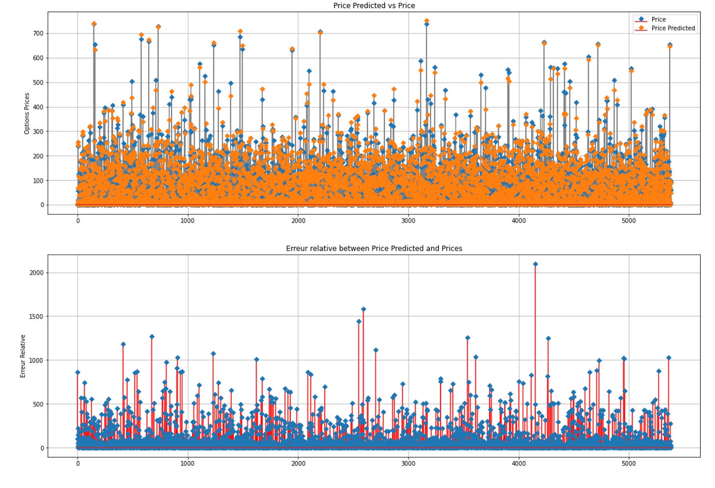 ax[1].set_title("Erreur relative between Price Predicted and Prices")Above is the code snippet that generates a figure containing two vertically arranged subplots. The first subplot exhibits a stem plot that juxtaposes the genuine option prices (‘Price’) against the anticipated option prices (‘Price Predicted’). It designates ‘Option Prices’ as the y-label, incorporates a legend, entitles it ‘Price Predicted vs Price’, and toggles on the grid for enhanced clarity. The second subplot showcases a stem plot of the relative error (‘Relative Error’) between the predicted and actual prices. It assigns ‘Relative Error’ as the y-label, entitles it ‘Relative Error between Price Predicted and Prices’, and activates the grid for better visibility.
