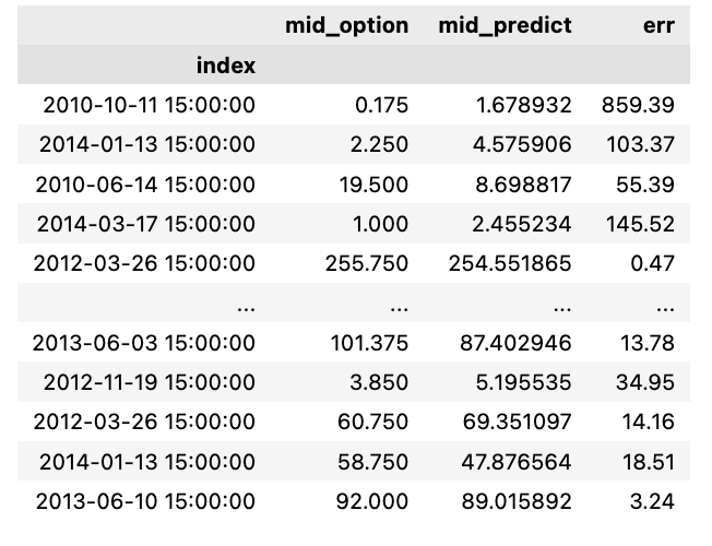 resultats[“err”] = round((np.abs(resultats.mid_predict — resultats.mid_option)/resultats.mid_option)*100,2): This section of the code computes the error rate. It involves finding the absolute variance between the predicted values and the real values (mid_option), then dividing this variance by the actual values, multiplying it by 100 to get a percentage error, and rounding it off to two decimal places. The determined error rate is subsequently added to the resultats DataFrame under the column titled “err”.