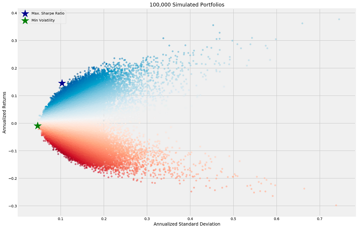 The code snippet generates a scatter plot that visualizes the results of a mean-variance optimization simulation with 100,000 simulated portfolios based on their annualized returns and standard deviations. The x-axis represents annualized standard deviation, indicating portfolio risk, while the y-axis shows annualized returns, reflecting potential profit. Each point corresponds to a different portfolio, with colors ranging from blue to red to signify varying returns.