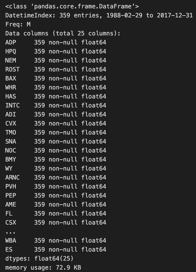 Next, the code further cleans the DataFrame by dropping any columns that contain only NaN values to focus the analysis on stocks with available return data. Finally, the code provides a summary of the resulting DataFrame, which has 359 entries covering the period from February 29, 1988, to December 31, 2017, with 25 columns representing different stocks, all containing non-null float64 data types. This indicates that monthly returns for all stocks are complete for the entire date range, with no missing data. The DataFrame’s memory usage is noted at 72.9 KB, suggesting efficient storage.