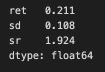 pd.Series({'ret': r, 'sd': sd, 'sr': (r-rf_rate)/sd})