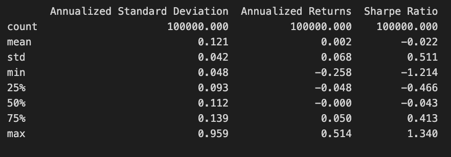 The Sharpe Ratio column measures risk-adjusted return, with a mean of -0.022 indicating that, on average, returns do not compensate for the risk taken. However, a maximum Sharpe Ratio of 1.340 suggests some scenarios significantly exceed the risk, while the minimum of -1.214 highlights poor performance instances.