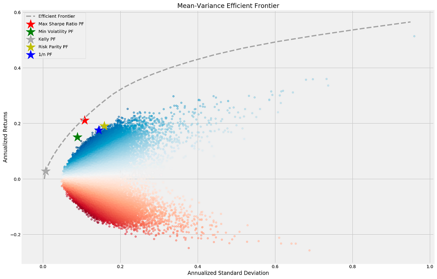 Key portfolios are highlighted: the maximum Sharpe ratio portfolio is marked with a red star, representing the best return per unit of risk, while the minimum volatility portfolio is indicated by a green star, reflecting the lowest risk. The Kelly portfolio is shown in dark grey, the risk parity portfolio in yellow, and the equal-weight portfolio in blue, which allocates equal weights to all assets. The efficient frontier is represented by a dashed line, signifying the optimal portfolios that provide the highest expected return for a given level of risk, typically sloping upward to show the relationship between risk and return. The legend clarifies the different portfolios and their markers. This output effectively demonstrates the risk-return relationship for various investment strategies, facilitating the comparative analysis of portfolio performance in mean-variance optimization.