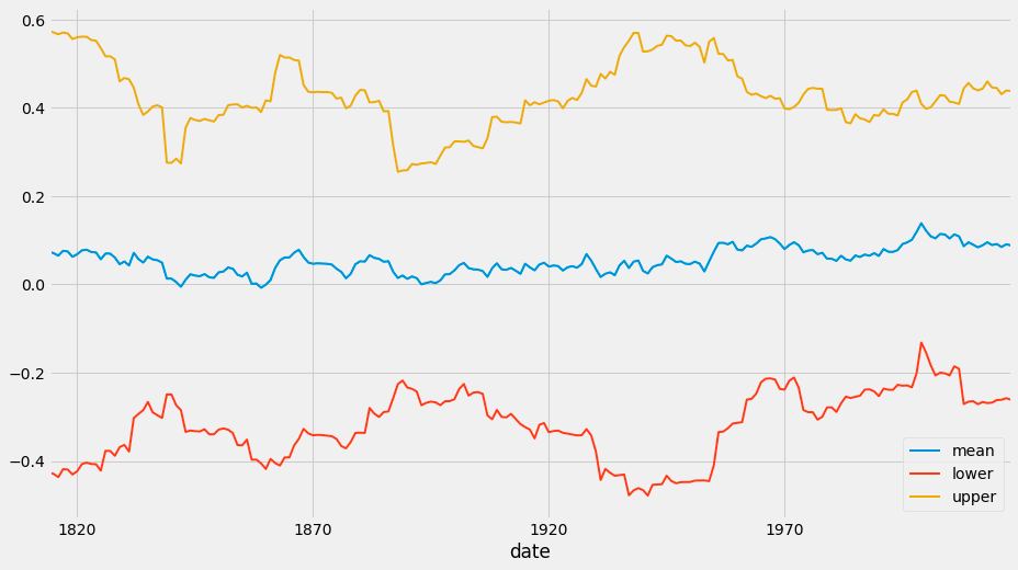 return_ci.plot(lw=2, figsize=(14, 8));The code snippet return_ci.plot(lw=2, figsize=(14, 8)) creates a visual representation of a dataset related to the Kelly Criterion, which determines the optimal size of bets in gambling or investing. The return_ci variable contains a DataFrame with statistical data, including mean returns and confidence intervals over time. The output displays three lines plotted against a timeline from the early 1800s to the late 1970s. The blue line indicates the mean return, the red line represents the lower confidence interval, and the orange line represents the upper confidence interval. These intervals show the range within which the true mean return is expected to lie, offering insights into the volatility and reliability of the returns. The visualization reveals trends in mean return over time, with fluctuations suggesting varying performance periods. The confidence intervals help indicate uncertainty, with wider intervals reflecting greater variability in returns. Analyzing the relationship between the mean and confidence intervals provides a better understanding of the investment strategy’s risk and the potential for higher returns in specific periods. Overall, this plot effectively analyzes the Kelly Criterion’s effectiveness in sizing bets based on historical data.