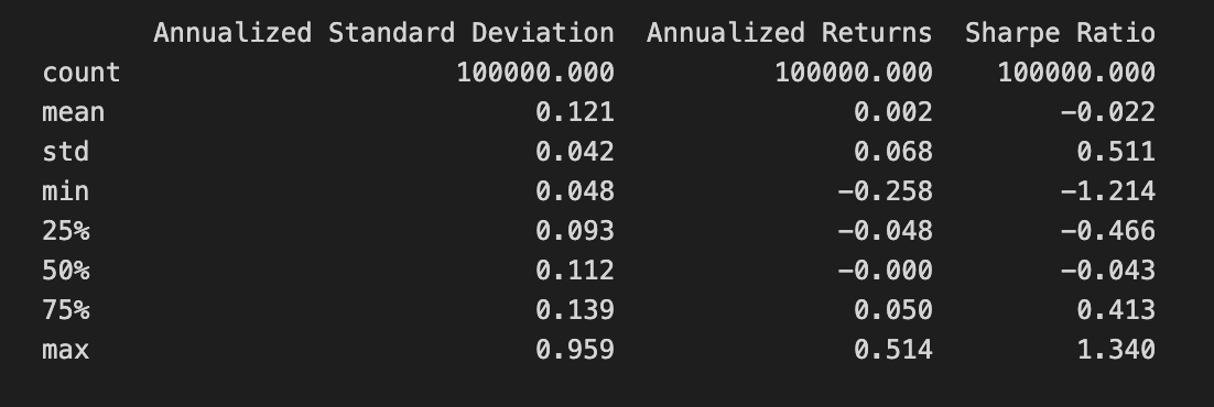 print(simul_perf.describe())The code snippet print(simul_perf.describe()) generates a statistical summary of the simul_perf DataFrame, which contains performance metrics from a Mean-Variance Optimization project. It provides key statistics for three financial metrics: Annualized Standard Deviation, Annualized Returns, and Sharpe Ratio.