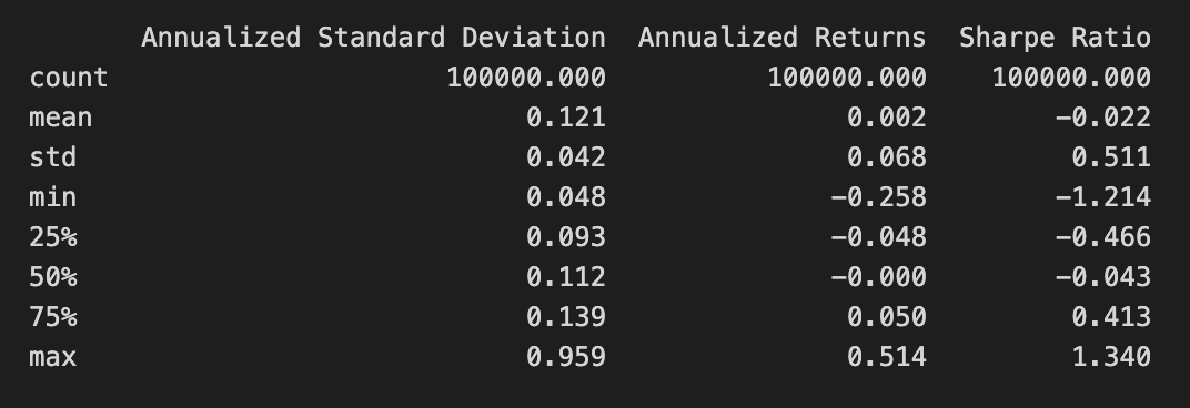 The Sharpe Ratio column measures risk-adjusted return, with a mean of -0.022 indicating that, on average, returns do not compensate for the risk taken. However, a maximum Sharpe Ratio of 1.340 suggests some scenarios significantly exceed the risk, while the minimum of -1.214 highlights poor performance instances.