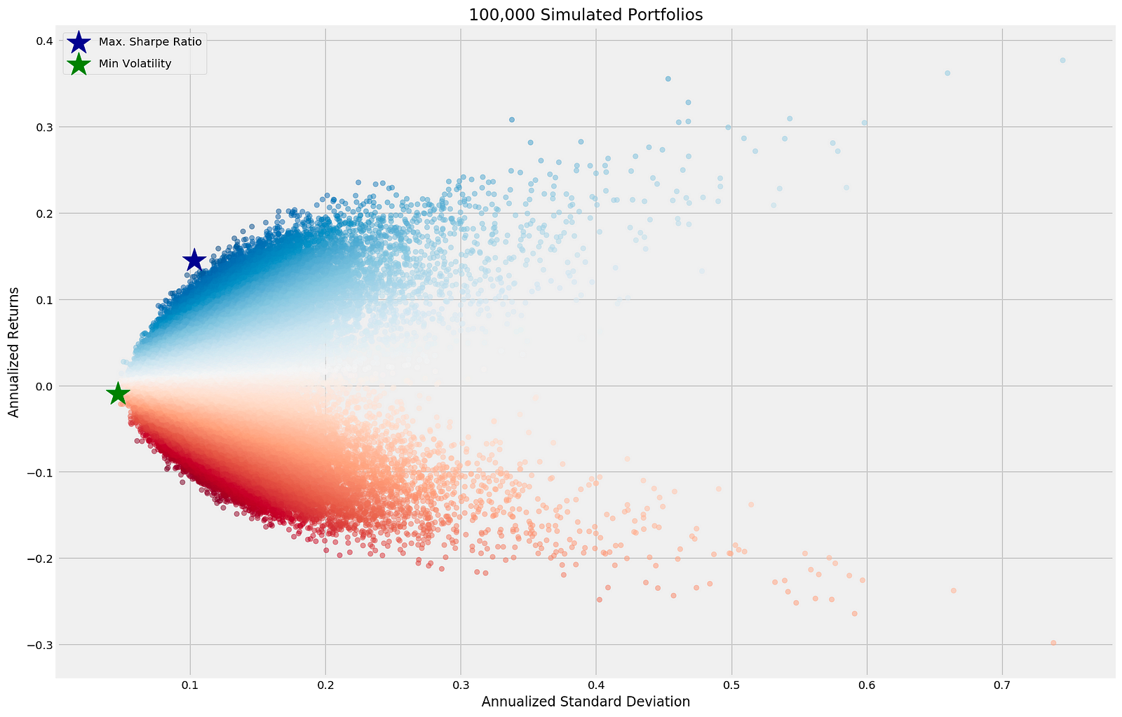plt.tight_layout()By analyzing the annualized returns and standard deviations of 100,000 simulated portfolios, the code snippet generates a scatter plot. An x-axis indicates portfolio risk, while a y-axis represents potential profit. The points represent different portfolios, with colors ranging from blue to red to indicate varying returns.