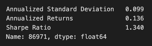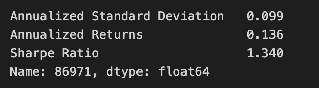 The output shows an annualized standard deviation of 0.099, reflecting the portfolio’s risk level, and annualized returns of 0.136, indicating the expected return over the year. The Sharpe ratio is 1.340, suggesting a favorable return compared to its risk, as a ratio above 1 is considered good. The output also confirms the index name and data type of the analyzed data. This code effectively identifies and presents the optimal portfolio based on the Sharpe ratio, supporting investment decision-making.