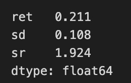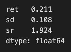 pd.Series({'ret': r, 'sd': sd, 'sr': (r-rf_rate)/sd})The code snippet extracts the maximum Sharpe ratio performance from a variable named max_sharpe_perf, which contains two values: return and standard deviation. A Pandas Series summarizes key performance metrics of a portfolio, showing a return of 0.211, or 21.1%, and a standard deviation of 0.108, indicating the portfolio’s risk with returns varying by about 10.8%. The Sharpe ratio is calculated using the formula (return — risk-free rate) / standard deviation, resulting in approximately 1.924. This suggests a favorable return per unit of risk, as a Sharpe ratio above 1 is generally seen as good. The Series is stored as float64, confirming the values are floating-point numbers, typical for financial metrics. This summary enables investors to assess the performance and risk profile of the portfolio in the context of mean-variance optimization.
