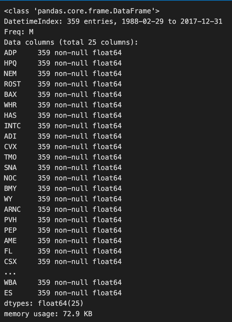 By dropping columns containing only NaN values, the code further cleans the DataFrame. In addition, the code provides a summary of the DataFrame, which contains 359 entries covering the period February 29, 1988, through December 31, 2017, all of which contain non-null float64 data types representing stocks. DataFrame memory usage is noted at 72.9 KB, suggesting efficient storage of monthly returns for all stocks over the entire period. This process ensures completeness and relevance in the monthly return data used for further analysis.