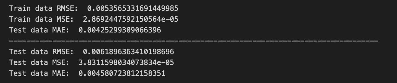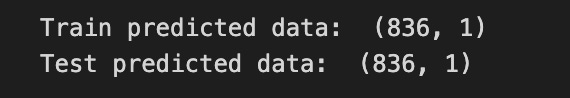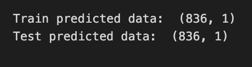 train_predict.shape, test_predict.shapeWe start with a single-line note that tells us our goal: run the model to make forecasts and then check how well those forecasts perform, like announcing we’re about to taste the dish after cooking. The first active line calls model.predict(X_train), which is like taking the recipe card (the trained model with its learned weights) and applying it to the training ingredients (X_train) to produce predicted outcomes; predict performs inference, the process of using learned parameters to generate outputs. The second line does the same on X_test, treating the unseen validation ingredients the same way to see how well the recipe generalizes beyond what it learned during training. Finally, the expression train_predict.shape, test_predict.shape asks each prediction array to report its dimensions — shape tells you the size and structure (for example, number of predicted time steps and output columns), much like checking the size of two baking trays before you try to combine them. That shape check is a small but crucial sanity check so subsequent steps — scoring errors, inverse-scaling, or plotting — won’t misalign arrays. Together, these lines move us from learning to actual forecasting and verification, the next steps being performance metrics that tell us whether our model can help forecast stock prices reliably.