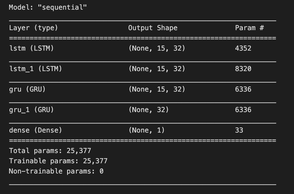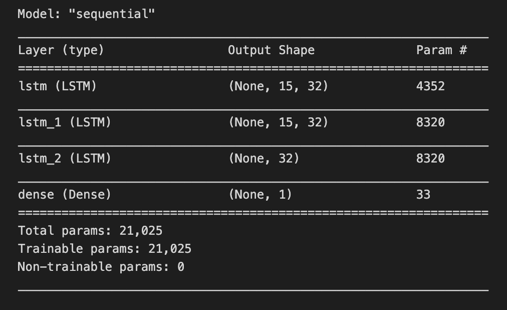model.summary()Think of your neural network as a layered cake you’ve just assembled: each layer is a different flavor, each connection a frosting ribbon, and you’re about to read the label to make sure you baked what you intended. model.summary() is that label-reading moment — when you ask the program to print a tidy description of the network so you can inspect its layers, the shape of the output at each step, and how many adjustable knobs (parameters) live in each part. A function is a reusable recipe card. Calling this particular recipe card causes the model object to list its architecture, show which parts are trainable, and give totals for parameters, which helps you judge capacity, performance cost, and risk of overfitting. Practically, you’d run model.summary() after defining the network and before training to catch mismatched dimensions, unexpectedly huge layers, or to document the design for collaborators. It’s a quick sanity check and a lightweight design review that saves time once you start feeding time-series data. By glancing at that summary you can decide whether to simplify, regularize, or deepen the network to better forecast stock market behavior.