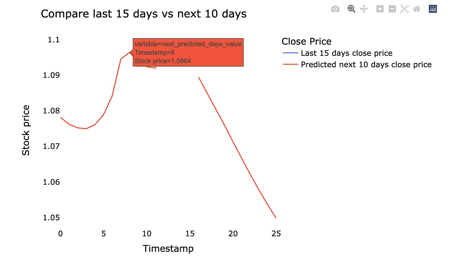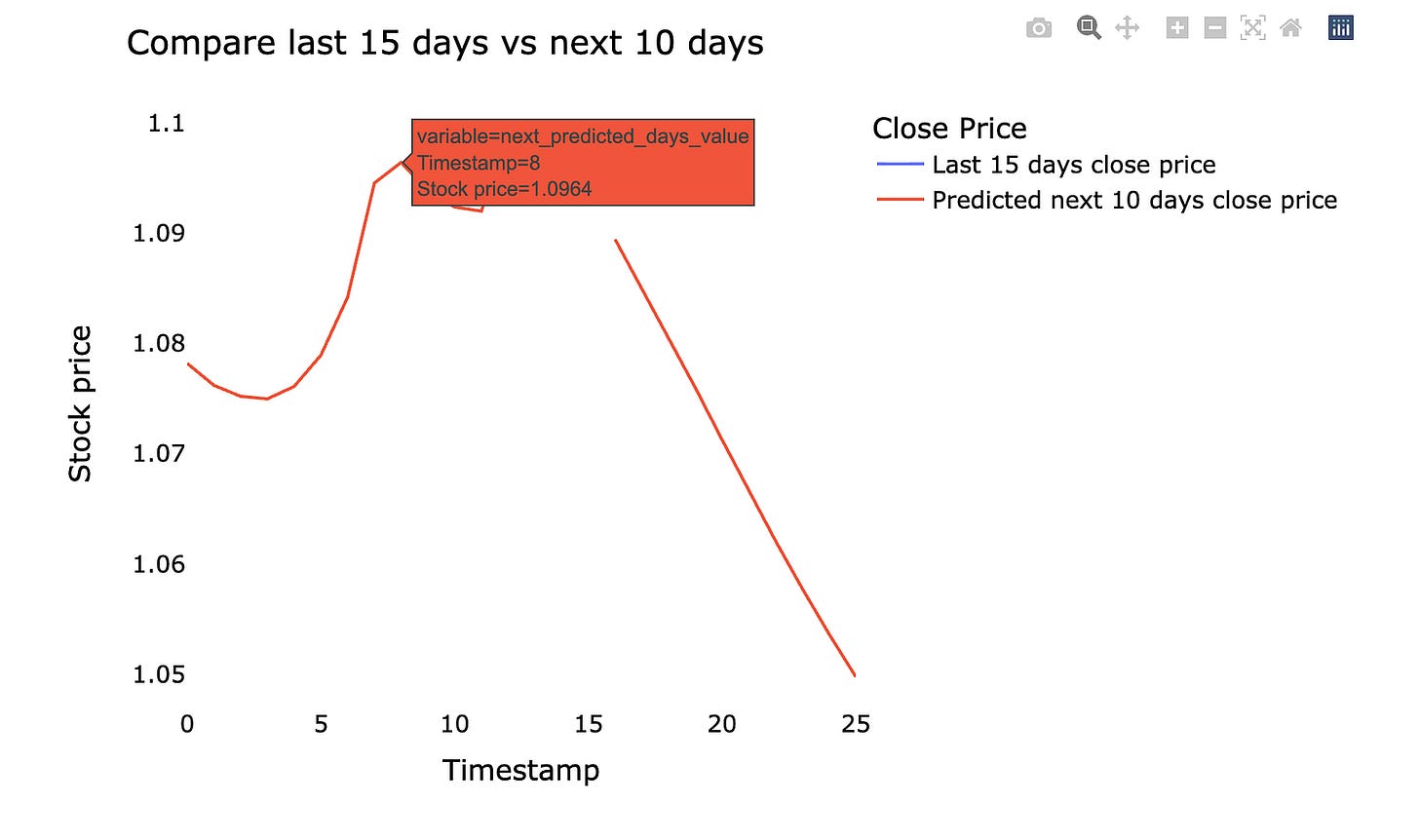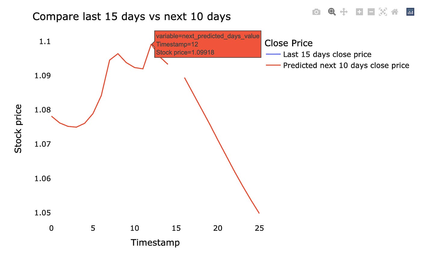 Using the last 15 days and the next 10 days keeps things practical: it focuses on near‑term behavior that matters for short‑term trading decisions and makes errors easier to spot quickly. This quick visual check is a simple but powerful step before digging into metrics or retraining the model.