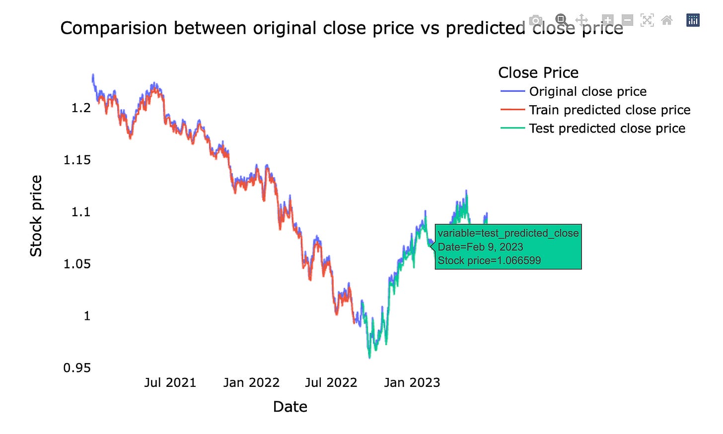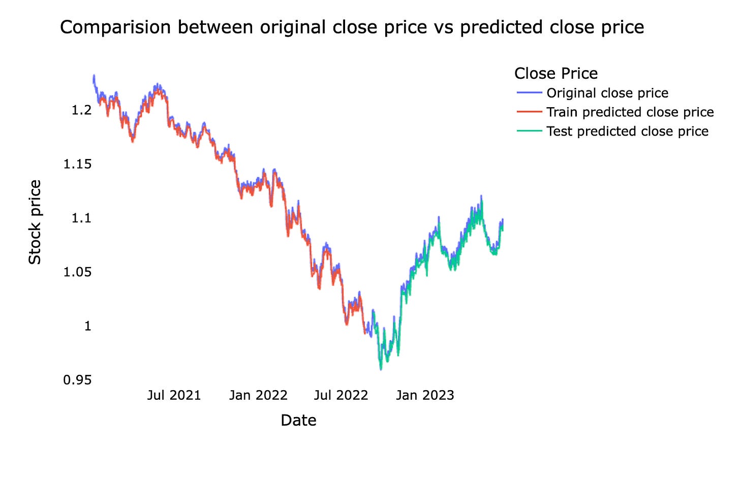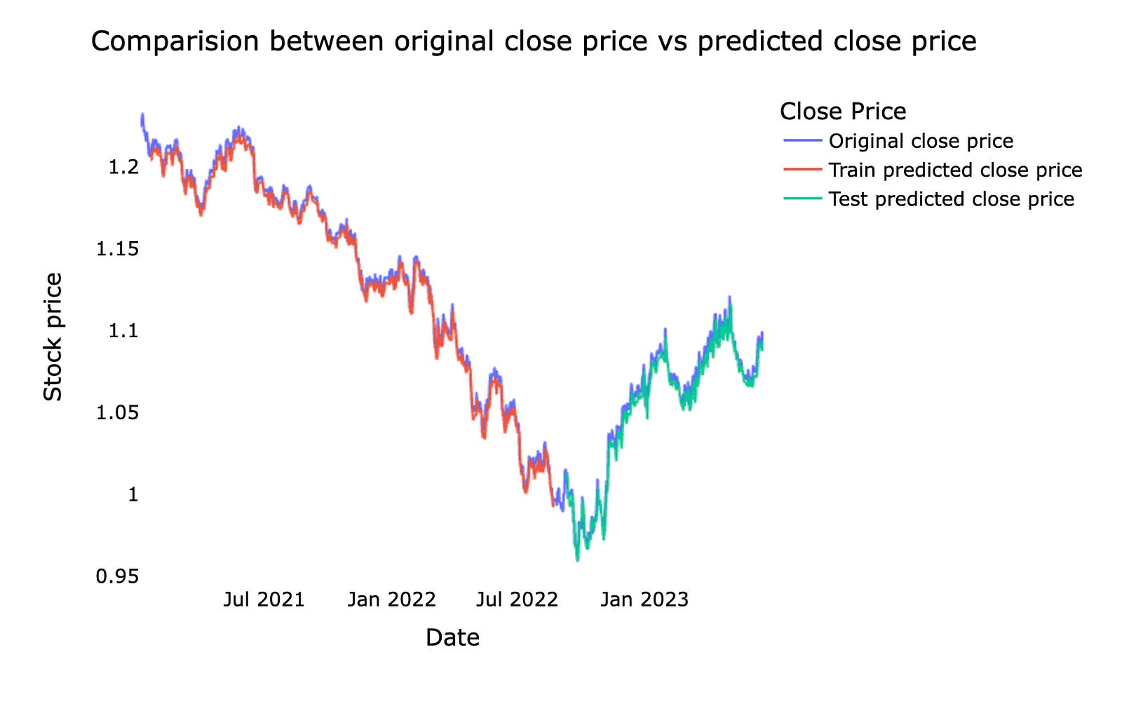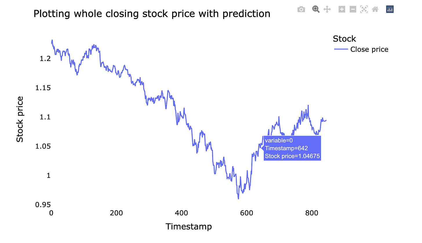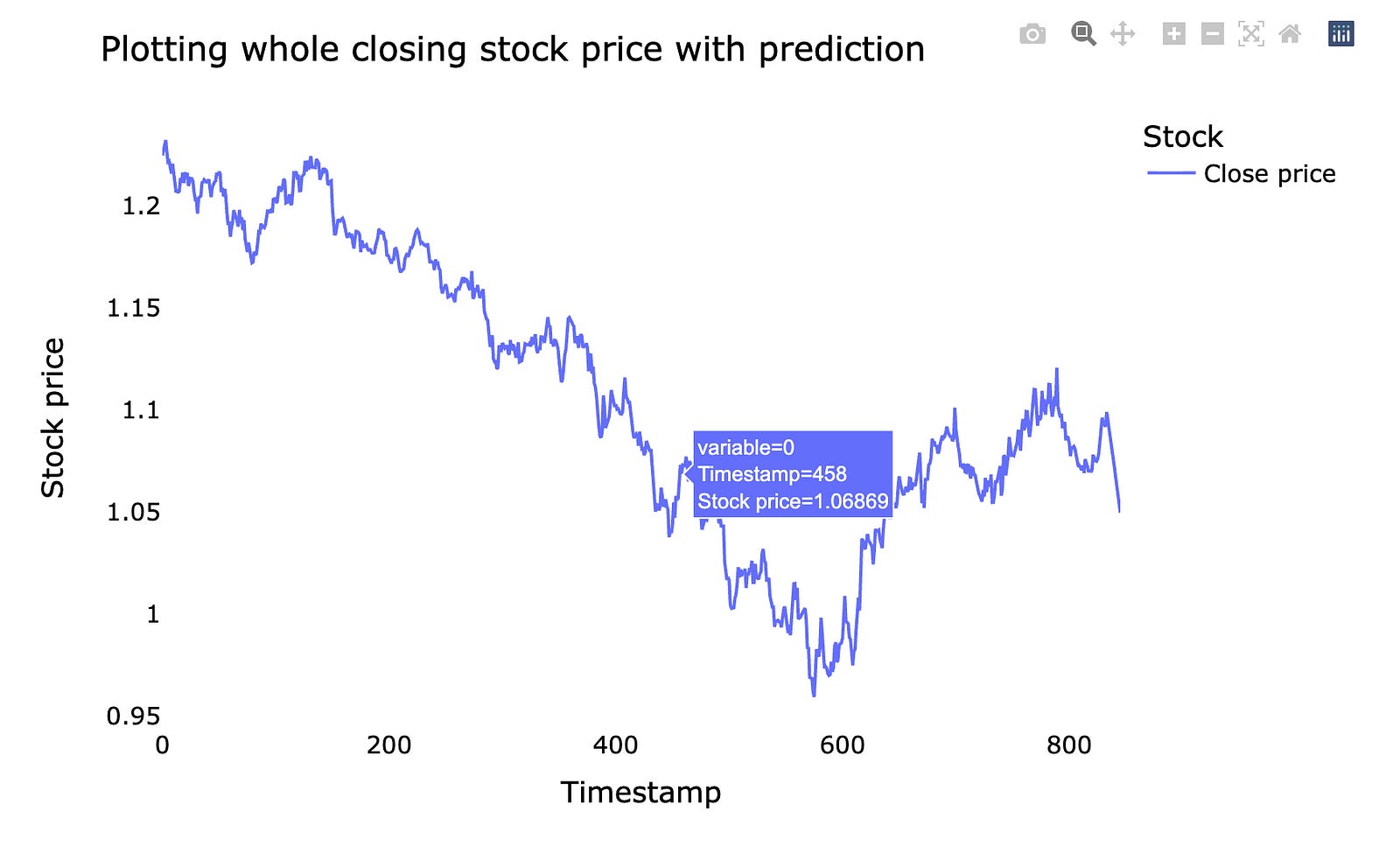 To give the plotted lines a friendly name we create a cycler of labels: names = cycle([‘Close price’]), which will repeatedly supply “Close price” if multiple traces appear. Then we draw the timeline with fig = px.line(lstmdf, labels={‘value’: ‘Stock price’,’index’: ‘Timestamp’}), where the plot function is like taking the numeric beads and stringing them onto an x–y frame with axis labels to explain what each axis means.