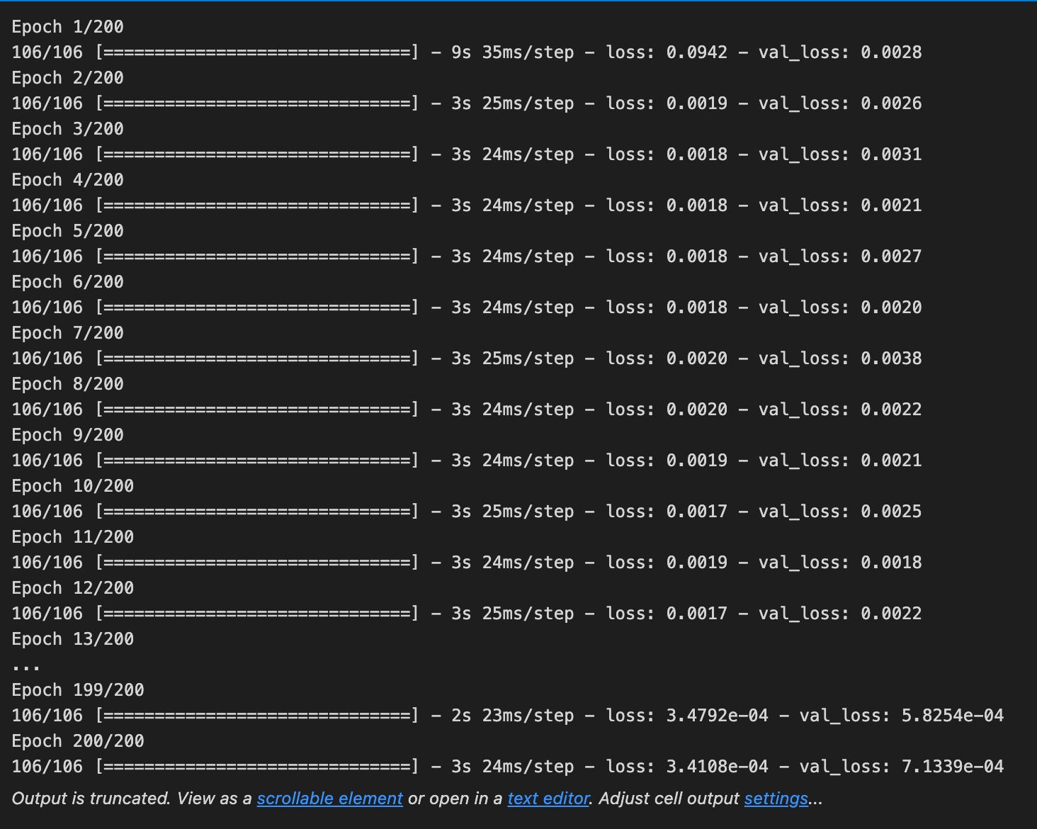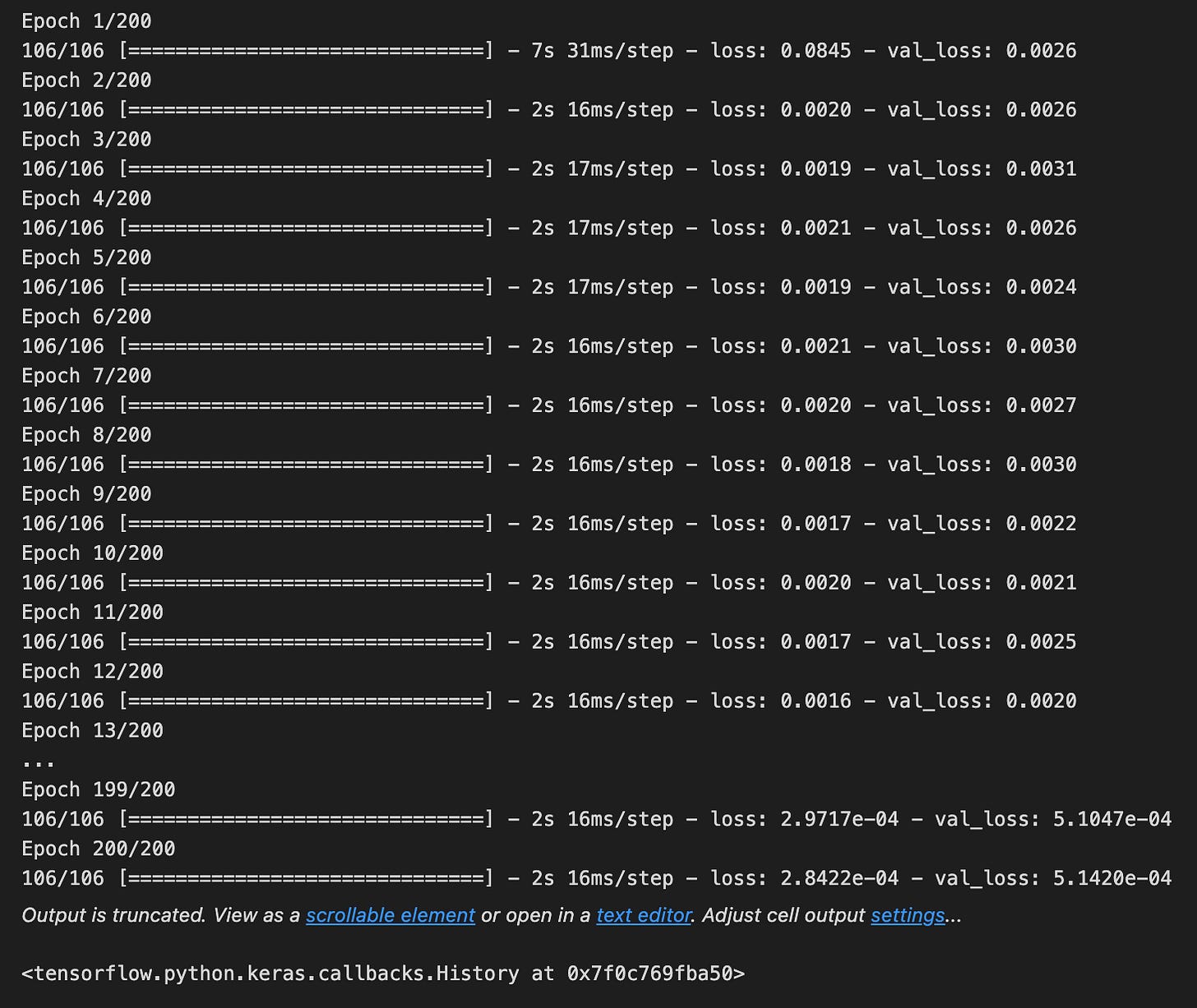 model.fit(X_train,y_train,validation_data=(X_test,y_test),epochs=200,batch_size=5,verbose=1)Imagine you have a student (the model) who needs to learn to predict stock prices from examples; calling model.fit starts the classroom session where you show the student pairs of inputs and correct answers so it can learn patterns. X_train and y_train are the training examples and their true targets — think of them as practice problems and answer keys that the student studies; a key concept: the model adjusts its internal parameters to reduce mistakes on these examples. validation_data=(X_test,y_test) hands the student a separate quiz set to take while learning so you can monitor how well it generalizes to unseen data; a key concept: validation data helps detect overfitting, when the student memorizes practice problems but fails on new ones. epochs=200 means the teacher will repeat the whole teaching book 200 times so the student gets many passes over the material; a key concept: an epoch is one full pass through the training set. batch_size=5 tells the teacher to grade and update the student’s understanding after every small group of five problems, which makes learning smoother and more efficient than updating after each problem or waiting until the whole book is done. verbose=1 simply controls the classroom display so you can watch progress updates. Altogether, this line runs the training loop that shapes the model into a forecasting tool, gradually tuning it so it can help predict stock movements.
