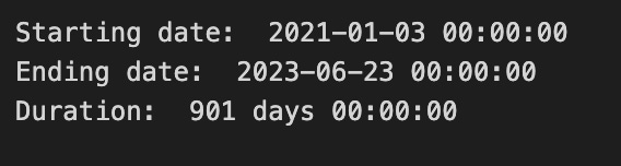 The third line prints the duration by subtracting the start date from the end date, which is like asking “how many pages lie between these two dates?” In pandas, subtracting two datetimes yields a Timedelta, a built-in way to represent an interval; this is a key concept because knowing the span of your data helps you choose appropriate training windows and evaluate seasonality. Each print simply writes those values to the console so we can eyeball them and sanity-check our timeline before moving on.
