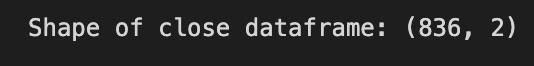 Next we print the shape of closedf with a friendly message so we can immediately see how many rows and columns we have: the shape attribute returns a tuple (rows, columns) that tells us the table’s dimensions at a glance. Printing shape is like checking the size of your batter before you bake — it confirms you have the expected number of observations and the right number of features, which helps catch problems early such as missing data or an accidental extra column.