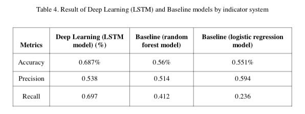 The forecasting accuracy was measured by RMSE and MAPE in [2]. ROC, MACD, and CCI were used to measure the trend following the characteristics of market prices. The authors used Duan et al. (2018)’s dataset to train and test their system architecture predictions on S&P 500 new process data in [7]. We used the Scikit-Learn library and the open-source openIE tool to implement logistic regression and Random Forest models. They set multi-head attention heads to 8 and started word nodes with 300-dimension GloVe embeddings.
