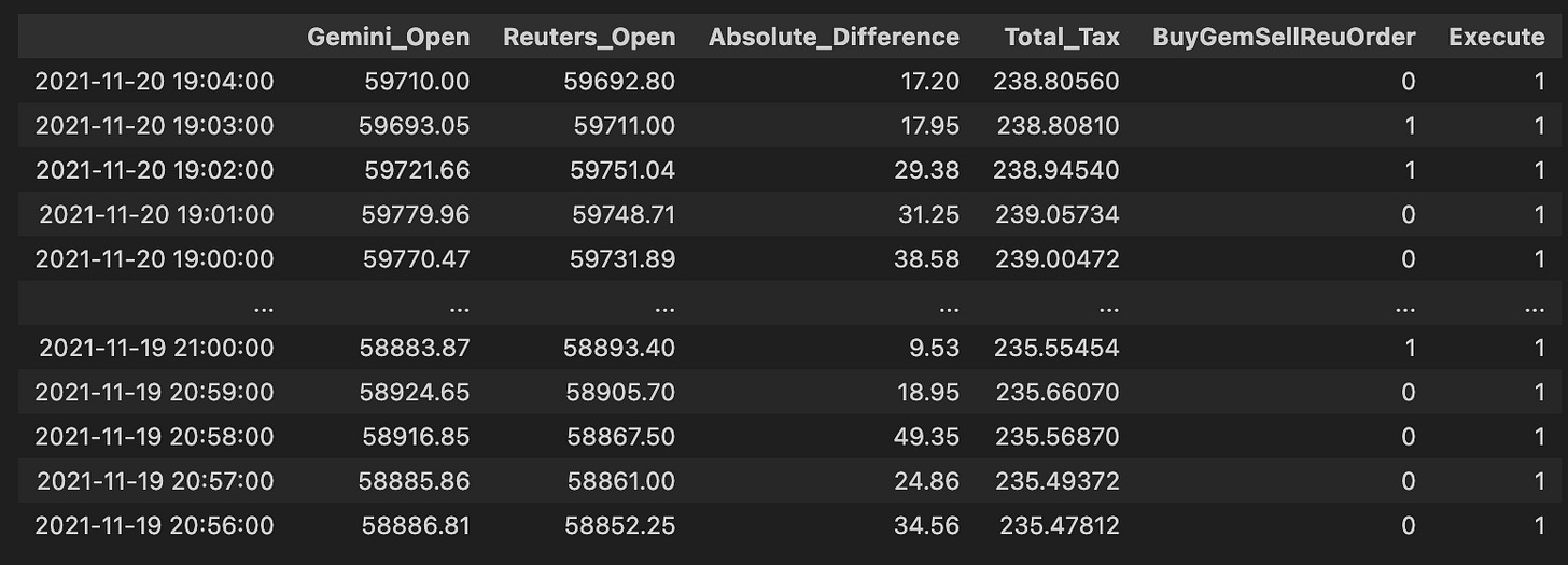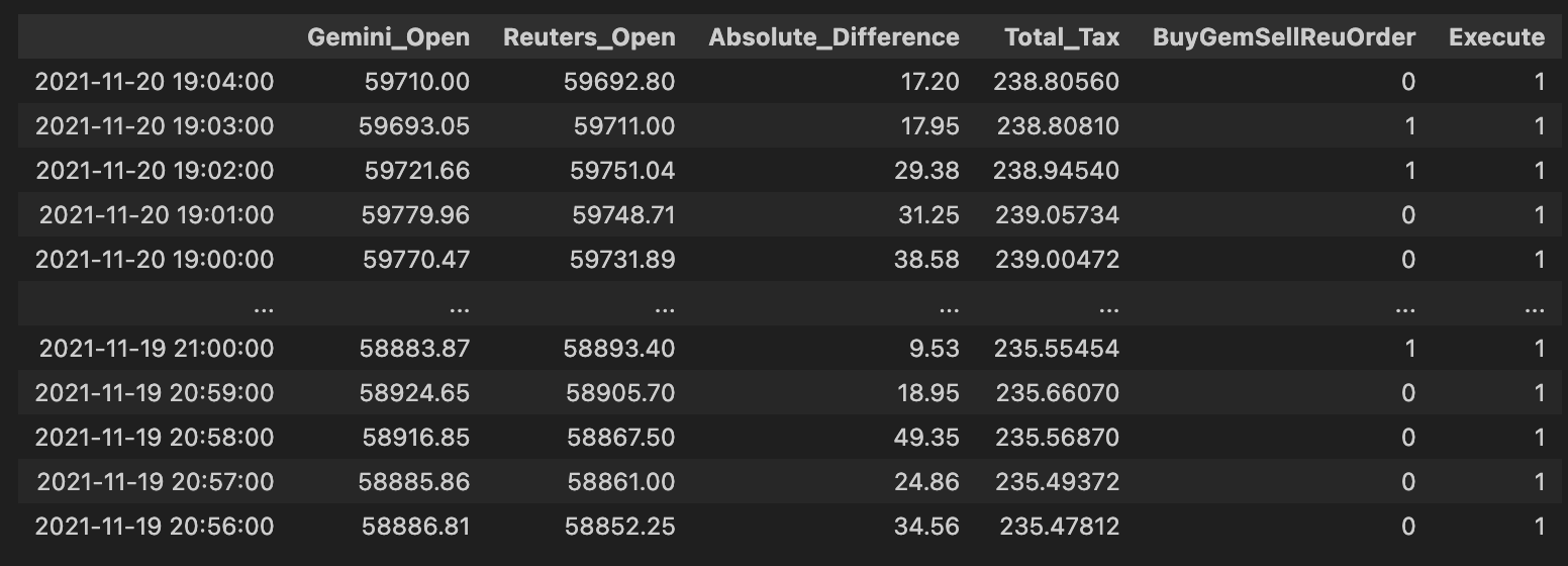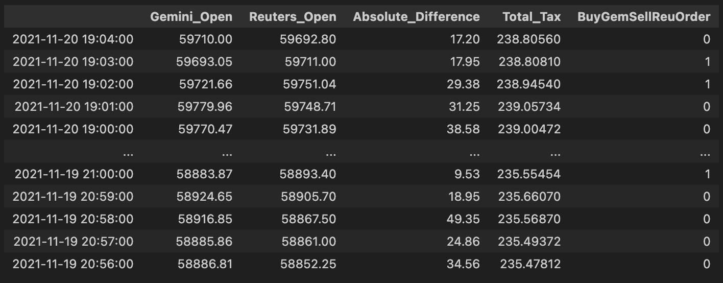 comb_df # Exchange Signal = 0, Sell Gemini; Buy ReutersThis block implements a simple, vectorized per-row trading signal used to drive pure arbitrage decisions between Gemini and Reuters for the same asset. Conceptually, for each timestamp (row) it asks a single question: which exchange currently quotes the higher open price? If Gemini’s open price is higher than Reuters’, the code emits a 0 for that row; otherwise it emits a 1. The intended business interpretation (according to the inline comment) is that when Gemini is more expensive you should sell on Gemini and buy on Reuters — i.e., take the short/offer side on the higher-priced venue and the long/bid side on the lower-priced venue to capture the spread.