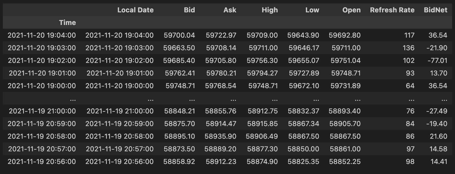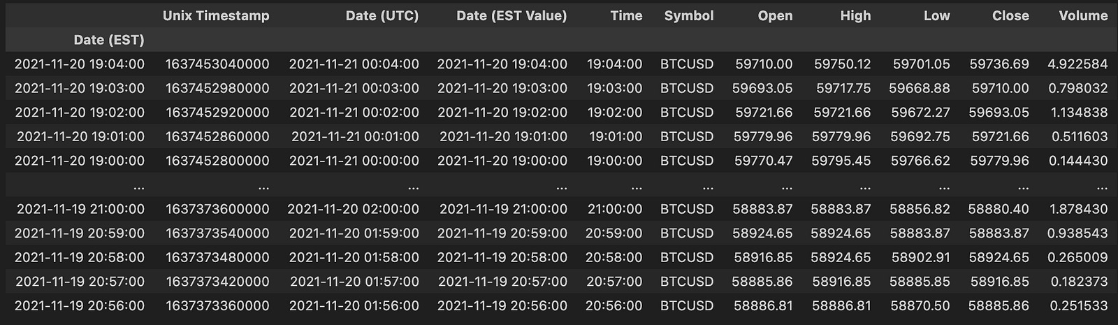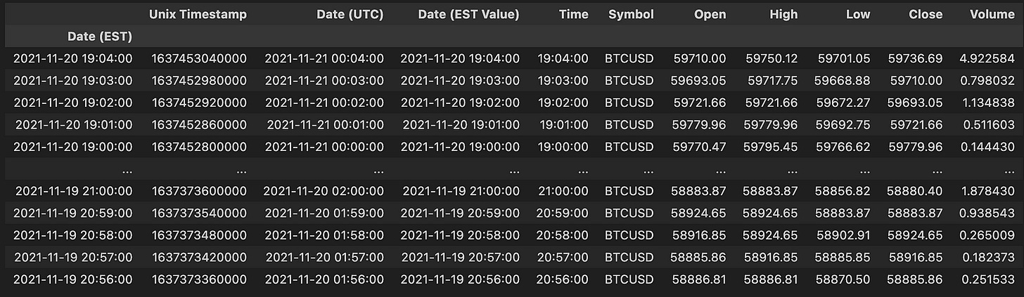 gemini = pd.read_excel(’BTCPrices.xlsx’,sheet_name = ‘Gemini’, na_values=None) # You would replace these datasets with