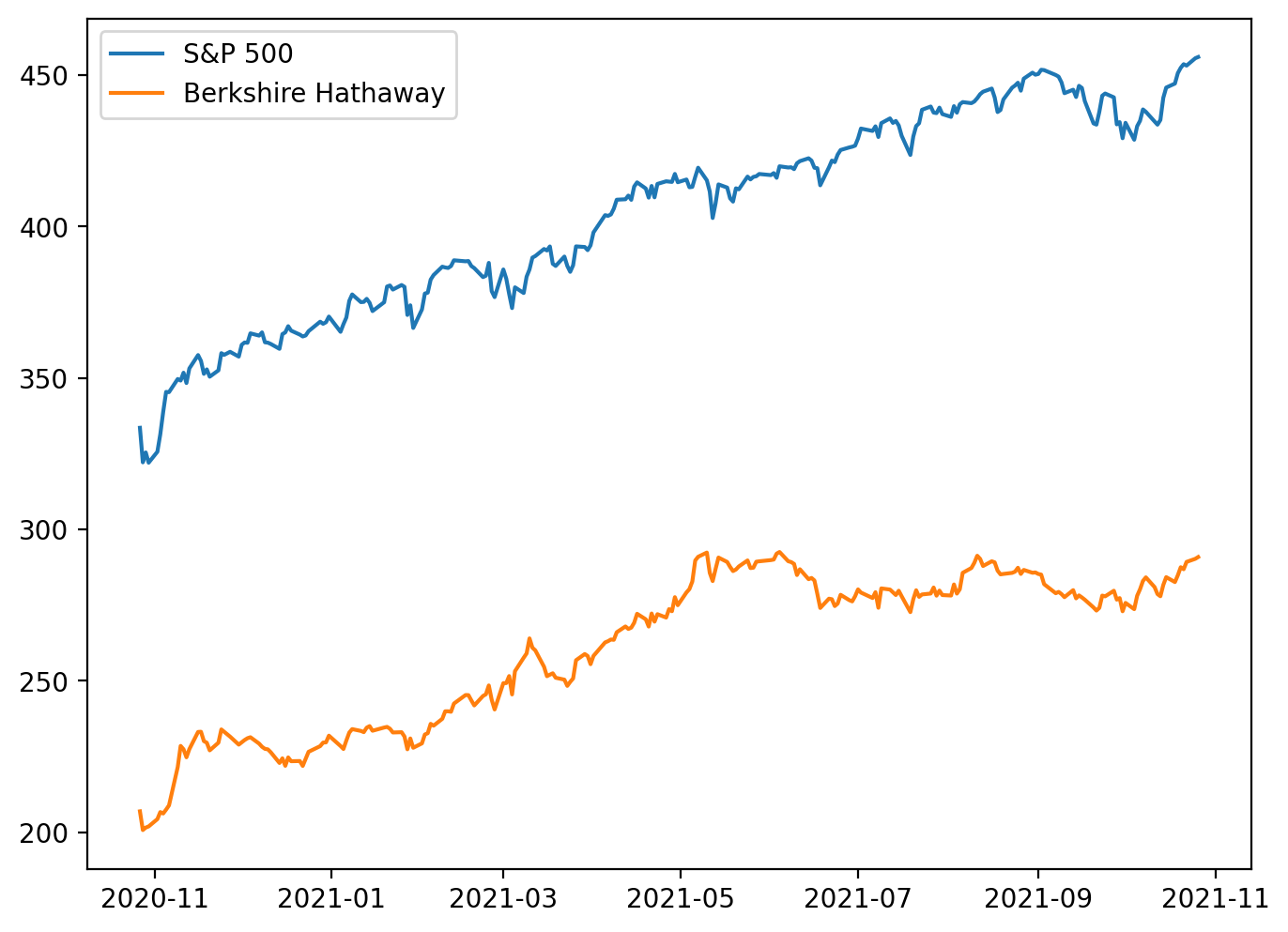 # Let’s look at a different one...This snippet is an exploratory visualization step early in a pairs‑trading pipeline: it pulls two series from the dataset (the S&P 500 index proxy and a Berkshire Hathaway share), sets up the plotting canvas resolution, and overlays the two raw price series to inspect their relationship. The plotting call uses the series’ implicit index (usually timestamps) so you’re effectively viewing two time‑series on the same x axis and comparing their raw magnitudes and trends. The legend call just makes the lines identifiable. In short, the code is asking “do these two instruments move together?” by eyeballing their price paths.