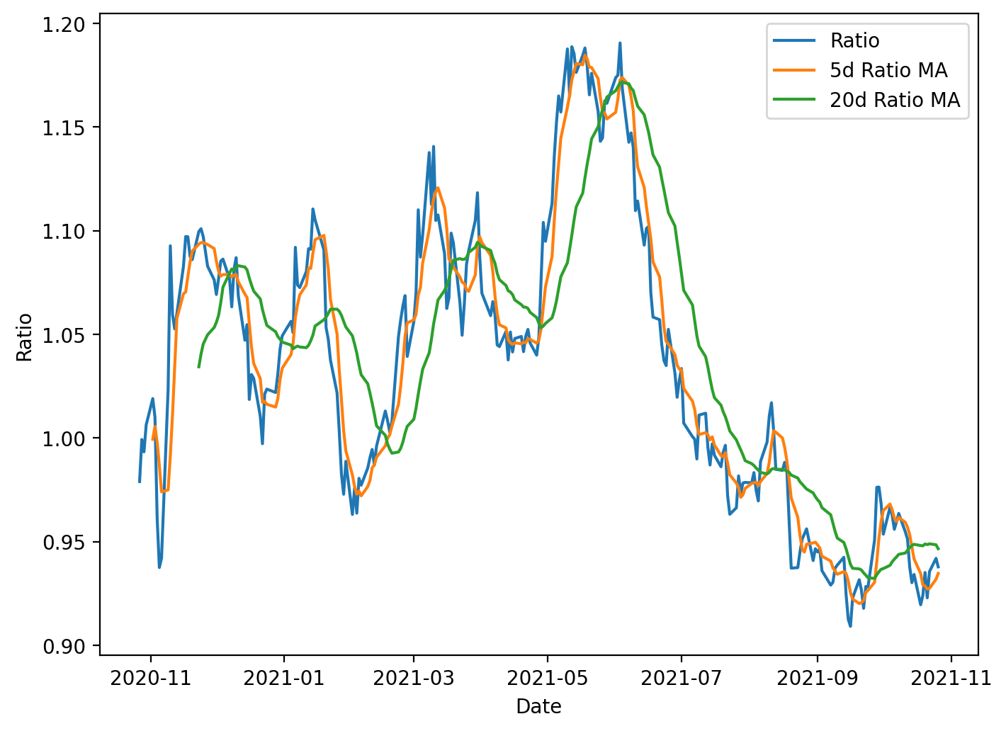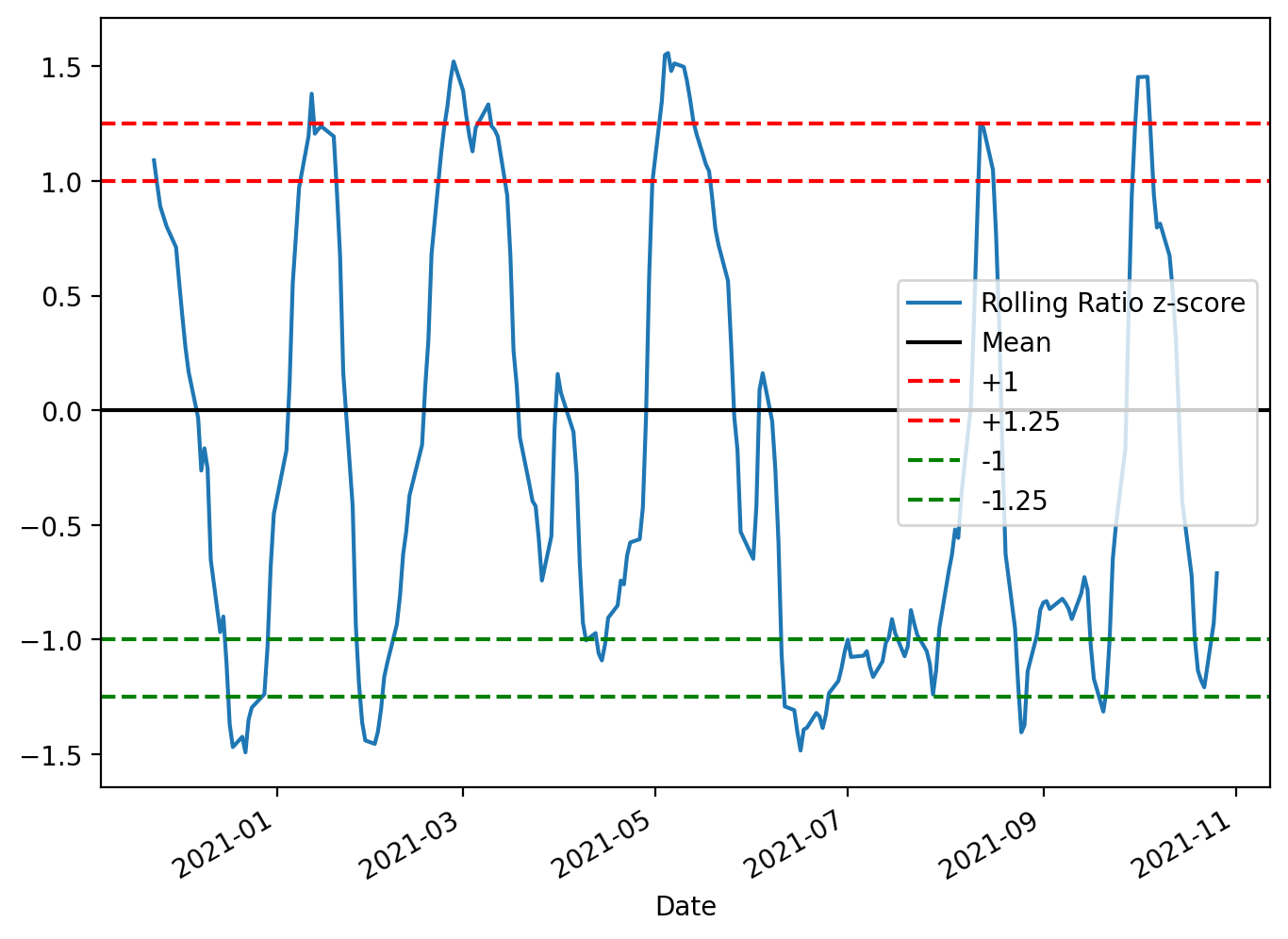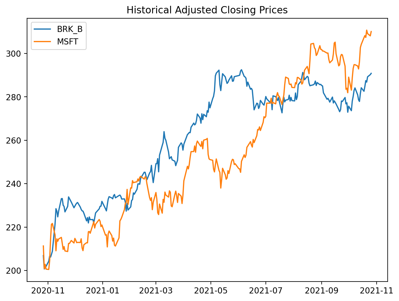 Why we do these specific steps: adjusted close is the right price field for mean-reversion work because it accounts for corporate actions (splits, dividends) that would otherwise create artificial jumps in the price series and bias spread calculations and returns. Aligning all series into one DataFrame (pd.concat with axis=1) ensures dates line up so pairwise operations (differences, ratios, regressions) compare values from the same trading days; pandas will naturally align by the datetime index and produce NaNs where data is missing, which downstream code must handle. The chosen date window (start=2020–10–27, end=2021–10–27) gives roughly one year of daily observations (~252 trading days), which the header comments indicate is the intended backtest window used to evaluate performance along an efficient‑frontier/backtest axis.