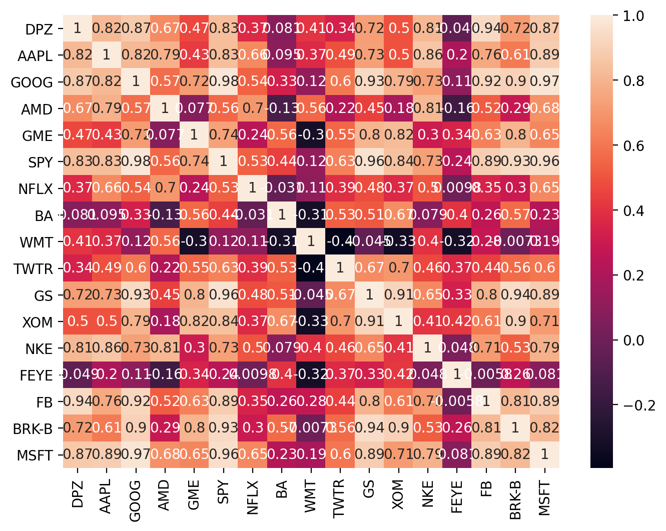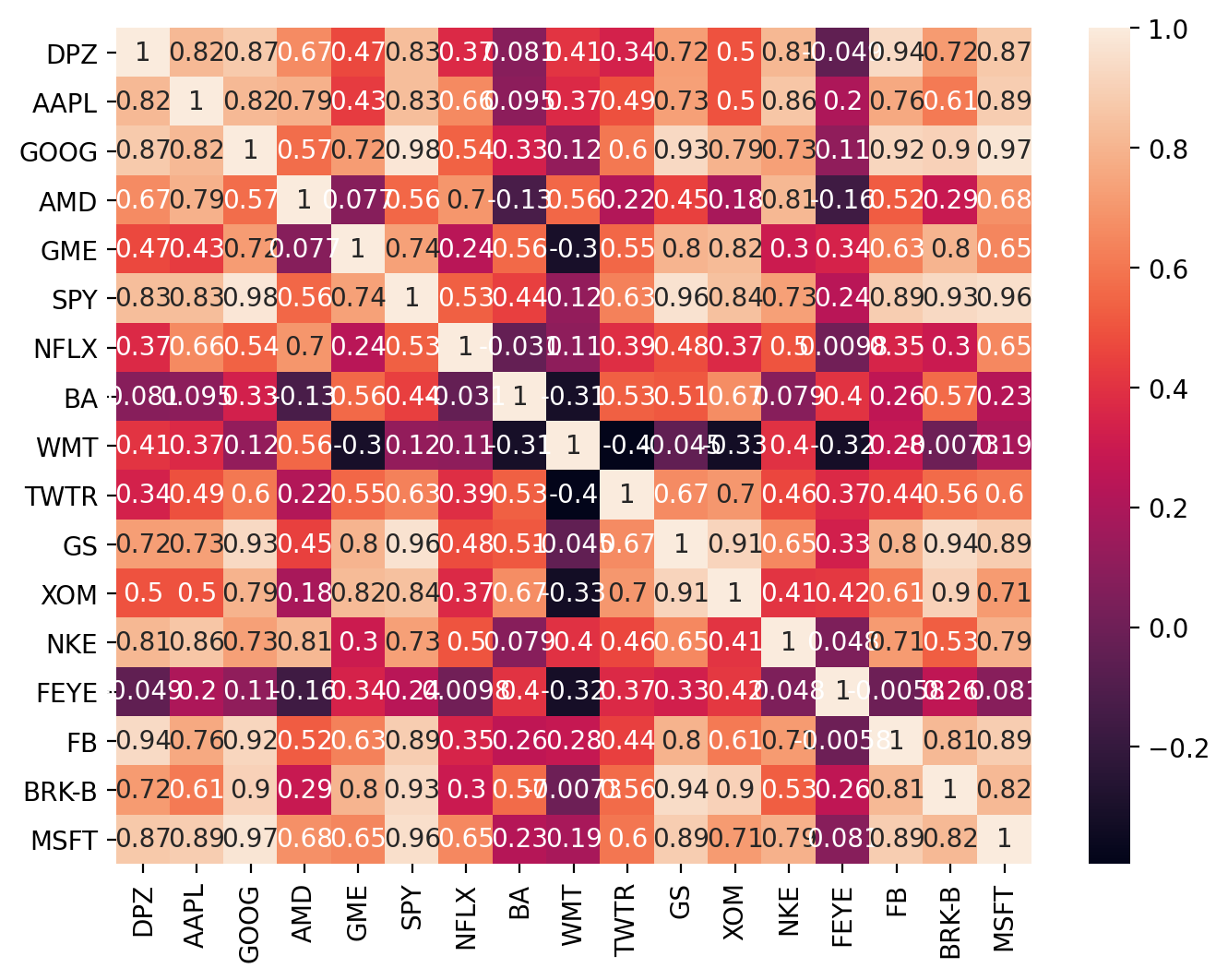 sn.heatmap(corr_matrix, annot = True)This code takes a precomputed correlation matrix of your asset series and renders it as a visual map so you can quickly spot relationships between instruments. Concretely, it creates a high-resolution plotting canvas and then asks Seaborn to draw a colored grid where each cell’s hue encodes the pairwise correlation and the numeric value is printed on top (annot=True). The visual encoding (color intensity and on-cell numbers) lets you see at a glance which pairs move together strongly, which move oppositely, and which show little linear association.