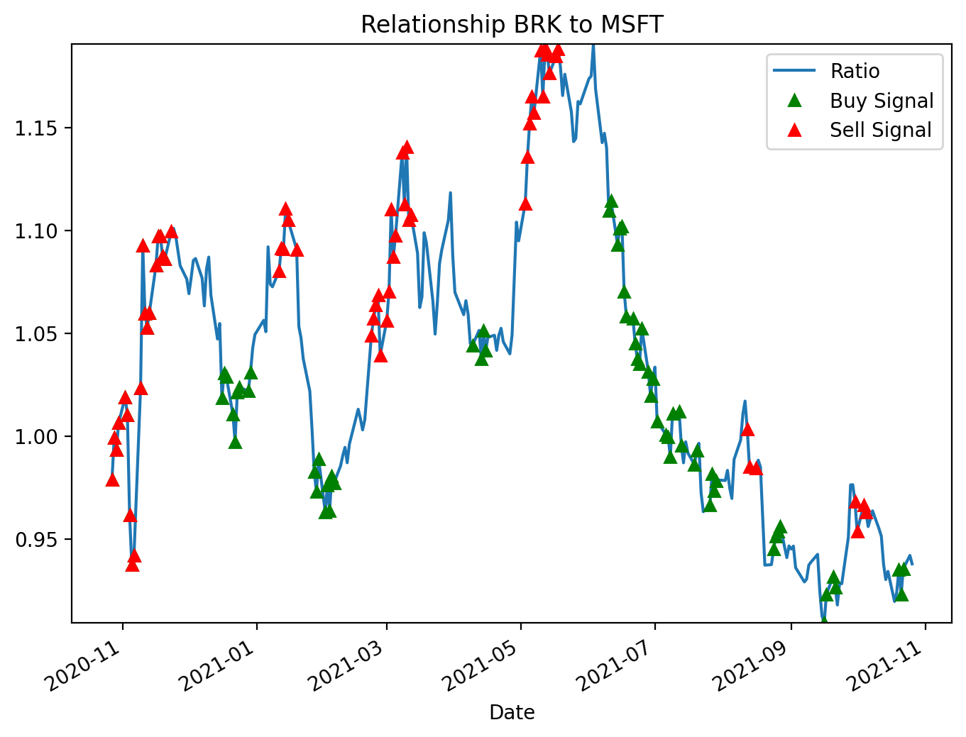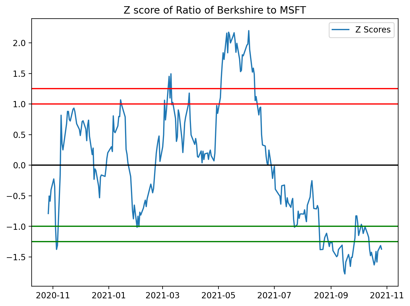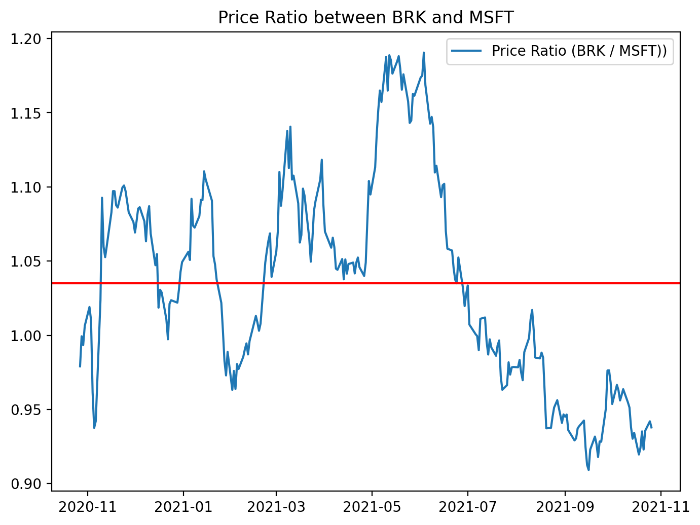 result = ts.coint(BRK_B, MSFT)This small block is performing the essential statistical check that underpins whether BRK_B and MSFT are a viable mean-reversion pair. Conceptually, for pairs trading we need a linear combination of the two price series whose distribution is stationary (i.e., the spread reverts to a constant mean). The statsmodels coint call implements the Engle–Granger two‑step cointegration test: it first fits an OLS regression between the two series to obtain the residual series (the putative spread or error term), and then runs a unit‑root test on those residuals to see if they are stationary. In effect you’re asking “is there a stable long‑run equilibrium relation between BRK_B and MSFT, or do their deviations wander off indefinitely?” — the null hypothesis of the test is that no cointegration exists (the residuals have a unit root / are non‑stationary).