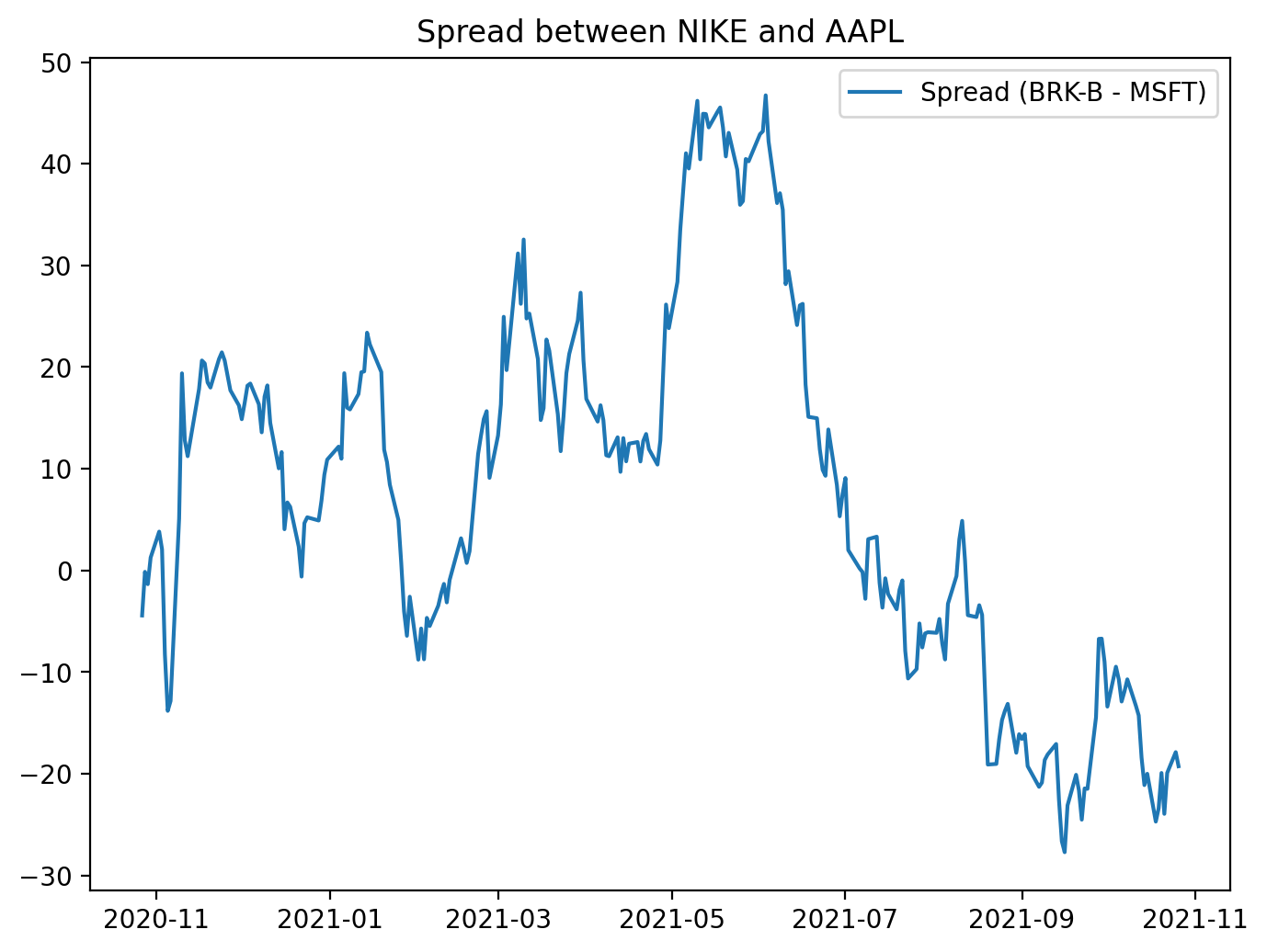 plt.title(”Spread between BRK-B and MSFT”)This block creates a focused visualization of the raw price difference between two tickers — BRK‑B and MSFT — to give an immediate, human-readable sense of whether their relationship behaves like a mean‑reverting spread. First the code establishes the plotting canvas with an explicit physical size and resolution (figure(figsize=(8,6), dpi=200)) so the chart is crisp and legible for inspection or inclusion in reports; that choice affects how much time‑series detail you can see and how it will render in different outputs. Next the spread is computed as BRK_B — MSFT and plotted; behind the scenes this subtraction is typically done on aligned time series (e.g., pandas Series indexed by date), so you should be aware that any misaligned dates produce NaNs and will need alignment or dropping before plotting. The plotted line is labeled and a legend is shown so the chart is self‑documenting, and a title clarifies that this is the spread between the two instruments.