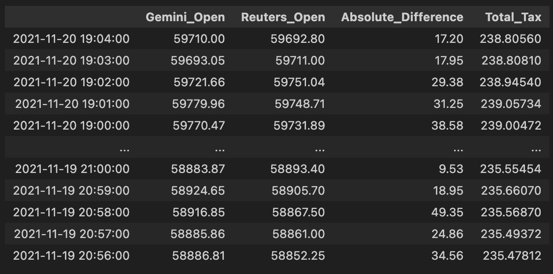 comb_df.columns = [”Gemini_Open”, “Reuters_Open”, “Absolute_Difference”, “Total_Tax”]
