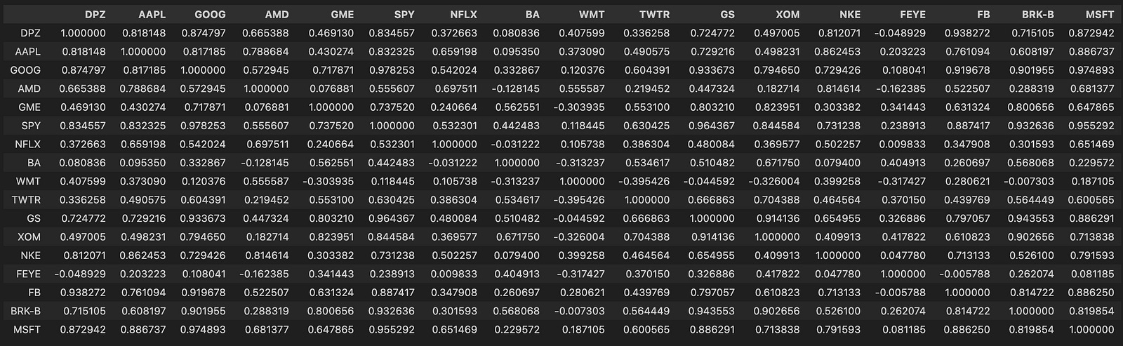 corr_matrixHere we take the DataFrame d (each column representing an asset time series — commonly prices or returns) and compute a pairwise correlation matrix with d.corr(), storing it in corr_matrix. The corr() call by default computes Pearson correlation between every pair of columns using pairwise-complete observations, so the result is a symmetric matrix with 1.0 on the diagonal and values in [-1, 1] elsewhere that quantify the linear co-movement between two series over the sample window.