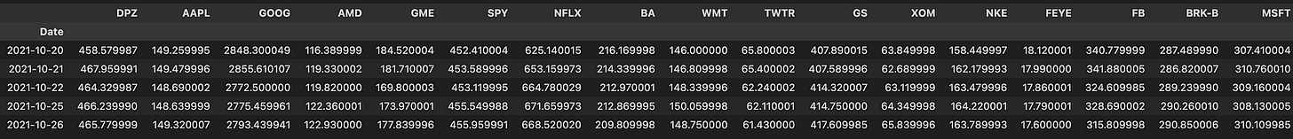 ticks = [”DPZ”, “AAPL”, “GOOG”, “AMD”, “GME”, “SPY”, “NFLX”, “BA”, “WMT”,”TWTR”,”GS”,”XOM”,”NKE”,”FEYE”, “FB”,”BRK-B”, “MSFT”] #Name of company (Dominos pizza)