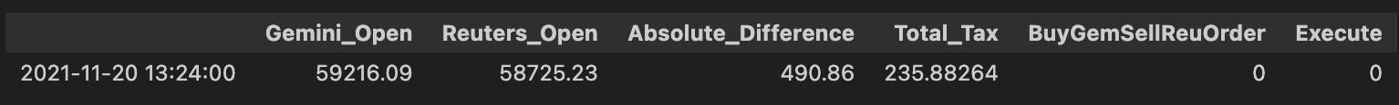 After creating the 2-D result of np.where, the code wraps it in a DataFrame and explicitly aligns the index to comb_df.index and names the column “Execute” so the new column will merge cleanly back into comb_df. Finally, comb_df = pd.concat([…], axis=1) attaches the flag column to the master DataFrame so later steps can filter on the Execute flag together with any directional exchange signal. In this codebase the convention is: Exchange Signal = 0 triggers “Sell Gemini; Buy Reuters,” and the Execute column further gates that signal by profitability.