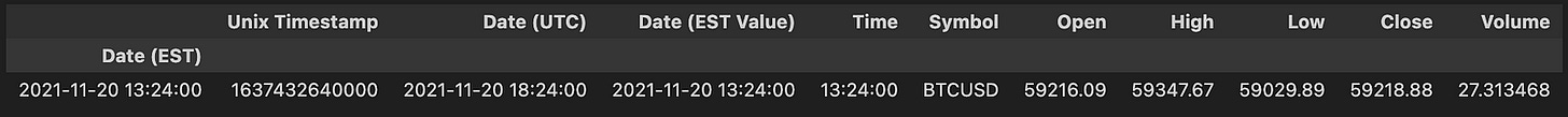 gemini[comb_df[”Gemini_Open”] == 59216.09] # 27.31 BTC!!! Probably explains that huge discrpency amongst the “exchanges”.This short fragment is doing two related things: documenting an assumption and then inspecting a suspected outlier row that exposes why that assumption matters for the pure-arbitrage logic. The comment at the top — “not even including the volume. (Hence everything will be a multiple)” — is the key design note: the current pipeline is comparing raw price fields across exchanges without scaling or constraining those comparisons by available volume or order-book depth. In practice that means any price difference you compute is purely a price multiple, not an executable arbitrage opportunity. A large price on one exchange will show up as a large arbitrage signal even if there is zero or very little liquidity at that price, so you get false positives.