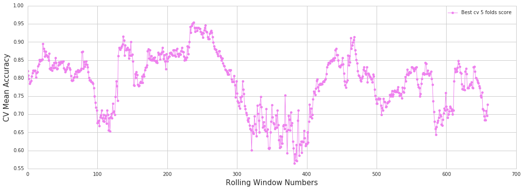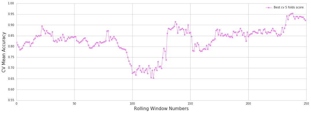 We then draw a connected line with markers for each window’s best CV mean accuracy (best_cv_score[0:250]) so two things are achieved simultaneously: the line highlights trend and direction across windows, while the point markers expose per-window volatility and any outliers. Using a distinct color and a modest line width/marker size keeps the plot legible when many points are present; the label clarifies that these values are the mean accuracy from a 5-fold cross-validation, i.e., the estimator’s expected generalization performance within each rolling sample. The legend is placed automatically (loc=0) to avoid overlapping the data, which is useful when inspecting many different performance plots side-by-side.