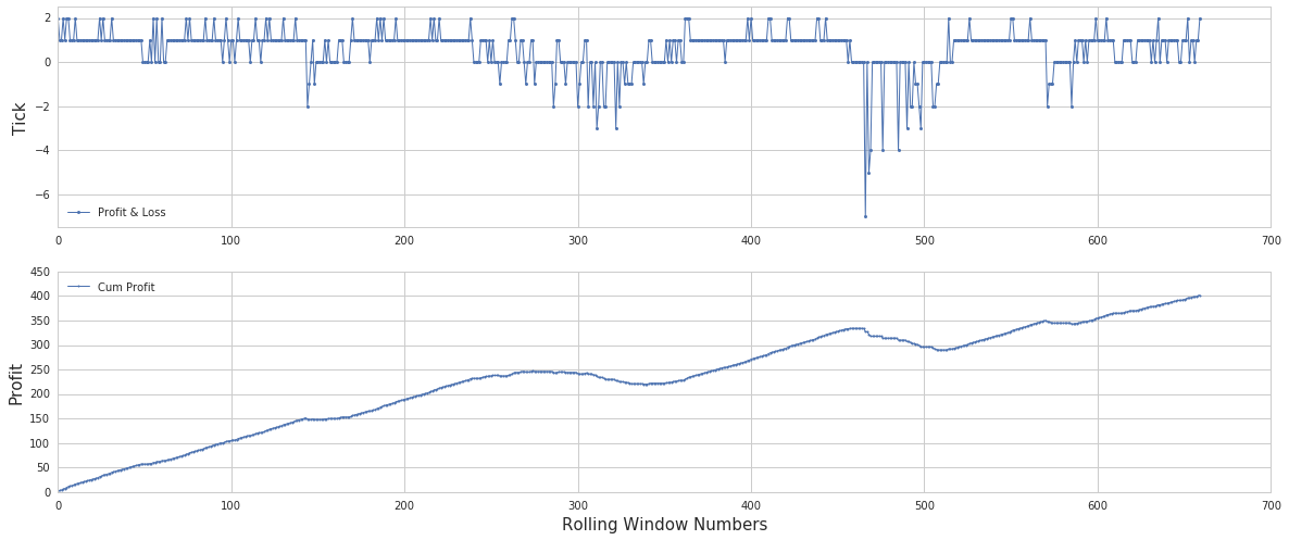 The bottom subplot (212) transforms that same sequence into a running total via cumulative sum, plotting the aggregated P&L across the rolling windows. This cumulative view answers the “so what” question: regardless of noisy per‑window behavior, does the strategy net positive performance over the sequence, or does it drift into sustained drawdown? Plotting cumulative profit makes trends, persistent biases, and the timing of drawdowns immediately visible; the x‑axis labelled “Rolling Window Numbers” makes clear the independent variable is the window index rather than calendar time. The legend placement is left to the plotting backend (loc=0), and slightly different marker sizing and line weight are cosmetic choices to balance point visibility against line clutter.
