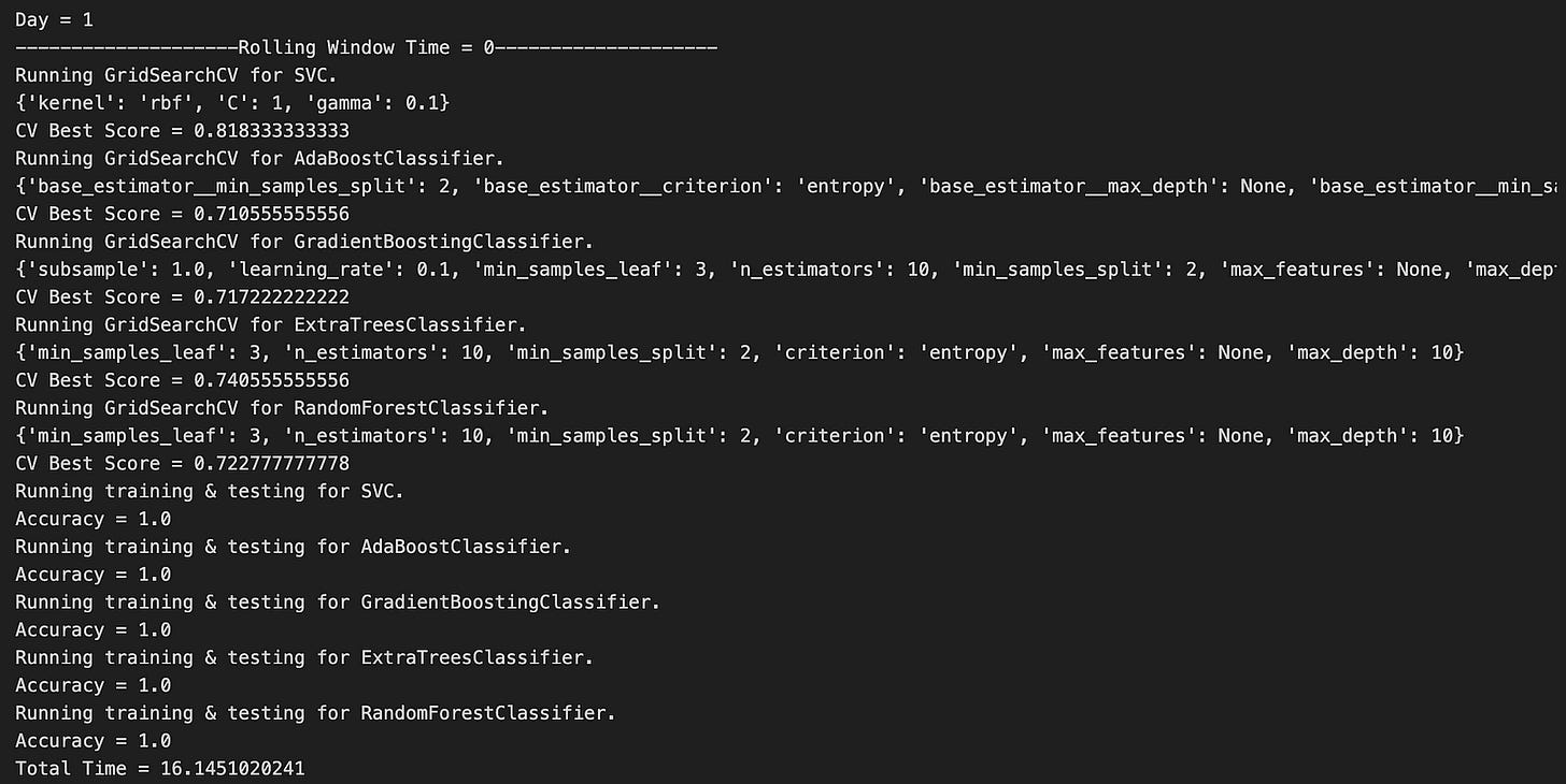 pip = Model_Selection(models,model_grid_params,data_2014,latest_sec,pred_sec,day)This small block is orchestrating a single model-selection run for a short-horizon quant strategy. The two integer constants define the temporal framing: latest_sec = 60 * 30 sets the lookback window to 30 minutes of market activity that will be used as the feature/context window, and pred_sec = 10 sets the prediction horizon to 10 seconds into the future. day = 1 identifies which day’s data or which dataset slice we’re operating on (used downstream to locate/time-segment data and to keep experiments reproducible across days).