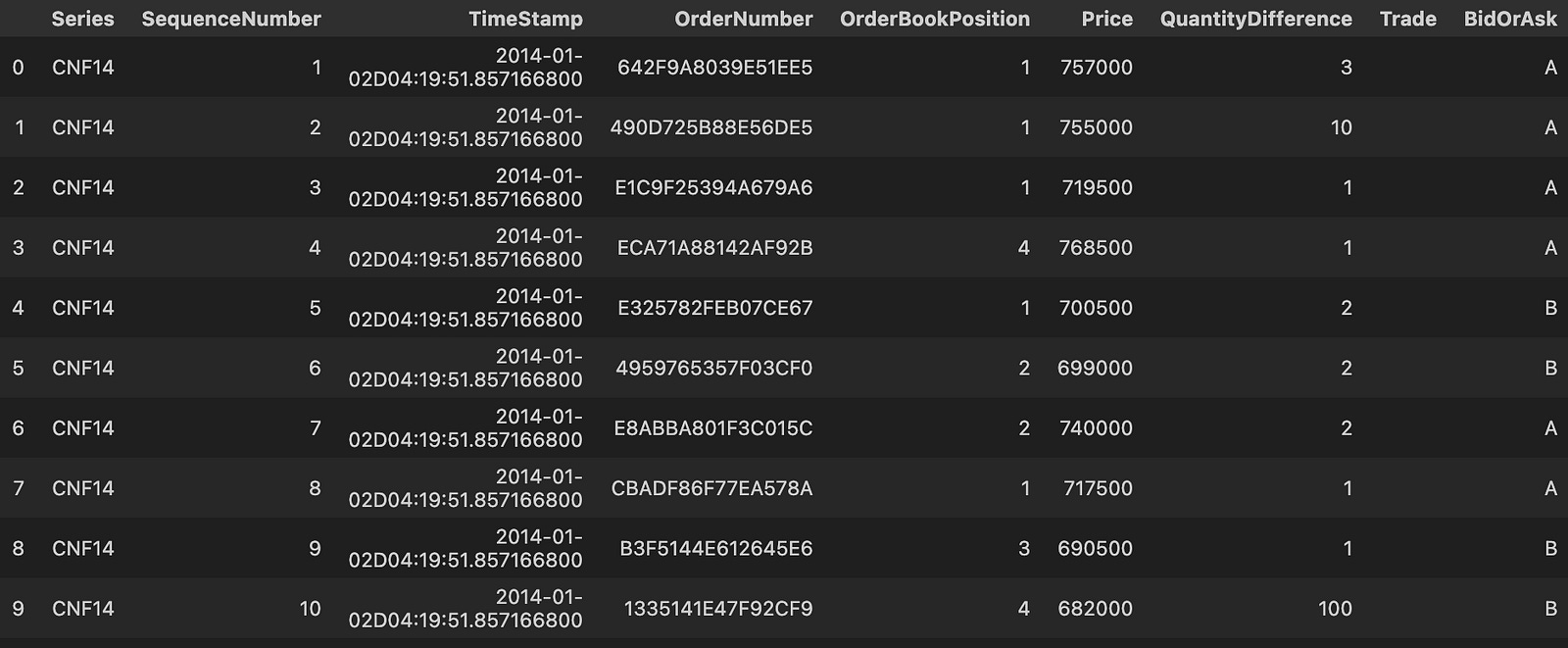 return timestamp_This function extracts the unique timestamps for a single trading session (market open through market close) for one futures contract from a daily CSV. It builds a file path for the requested month and day, reads the CSV into a DataFrame, then immediately filters to the instrument of interest (Series == ‘CNF14’) so that further indexing operates only on that contract’s tick stream rather than interleaved instruments. Constraining to a single contract is important in quant trading because every downstream calculation (VWAP, orderbook reconstruction, feature windows) must operate on a consistent symbol; mixing symbols would corrupt time-series alignment and signals.