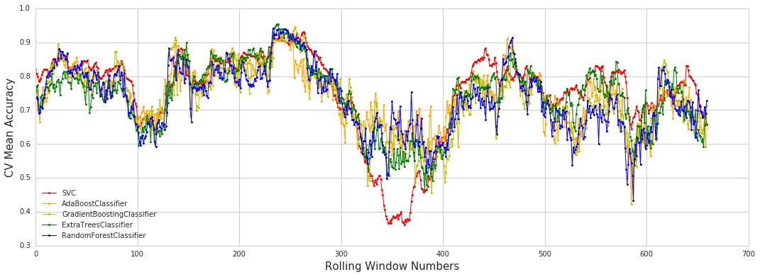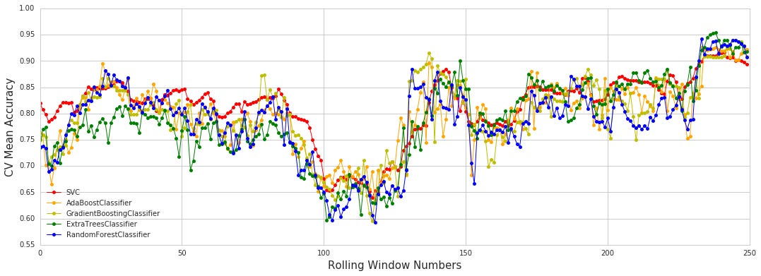 plt.ylim(0.55,1)This block builds a visual diagnosis of model stability by plotting the cross-validated mean accuracies for several pipelines across a sequence of rolling windows — a common way in quant trading to check how model performance changes through time as you re-train or re-evaluate on successive windows. It starts by choosing a clean, grid-backed plotting style and a wide figure so many consecutive windows can be displayed without crowding; these choices improve readability when you want to inspect temporal patterns and small differences between models.