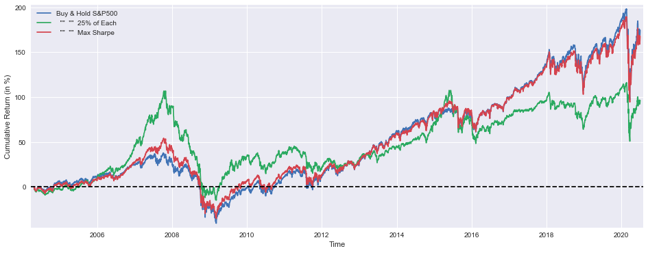 print('Median yearly excess return over SP500 =',round((msBuyHold1yAll.median()-SP1Y.median())*100,1),'%')As a result of this code, a plot can be created that shows the cumulative returns on various investment strategies compared with S&P 500 performance. With this tool, you are able to generate a 16 x 6 inch figure and plot three strategies as percentages on it. A number of the strategies used by these funds are Buy and Hold strategies for the S&P 500, diversified portfolios that place equal weights on four assets, and Max Sharpe strategies designed to maximize risk-adjusted returns based on risk-adjusted returns. On the plot, we have defined margins for the x and y axes to define the axes for the time and cumulative returns percentage, as well as the axes for the time. The horizontal dashed line at zero y coordinate serves as a reference, and a legend is displayed before each figure to highlight the strategy that is being used.