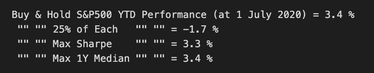 print(' "" "" Max Sharpe "" "" =',round(float(YTD_max_sharpe[-1:]*100),1),'%')