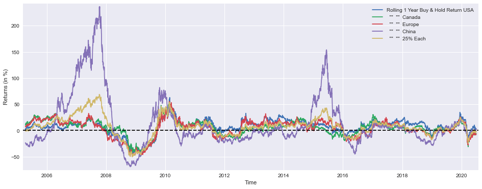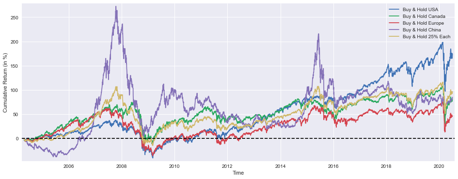 plt.show()A line plot is generated by this code in order to visualize the cumulative returns of various investment strategies over the course of time. There is a feature built into the system that creates a 16 by 6 inch figure that plots multiple lines for different portfolios, including Buy and Hold strategies for the USA, Canada, Europe, and China, as well as a diversified portfolio with 25% in each region. It is necessary to multiply a return value by 100 in order to present it as a percentage. As you can see from the chart, the x-axis is labeled for time, and the y-axis indicates cumulative returns as a percentage. There is a horizontal reference line at zero included in the plot so that it can be used for performance evaluation and margins are defined to keep data points off the plot edges. Using plt.show(), the figure will be displayed which identifies the different strategies, and a legend will identify them.
