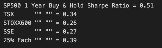 BuyHold_25Each = BuyHold_SP*(1/4) + BuyHold_TSX*(1/4) + BuyHold_STOXX*(1/4) + BuyHold_SSE*(1/4)There are four stock market indices that this code calculates the return on for a buy and hold investment: the S&P 500, TSX, STOXX 600, and SSE. As part of this calculation, the current value of each index is retrieved from the ICP DataFrame and divided by the initial value to determine the percent change in value since the start of the recording. There is a code in the file that calculates an average return over the four indices, each of which is equally weighted at 25%, after determining the buy and hold return for each index. In this way, a diversified investment strategy in these markets will be measured by a single metric that represents the overall performance of the strategy as a whole.