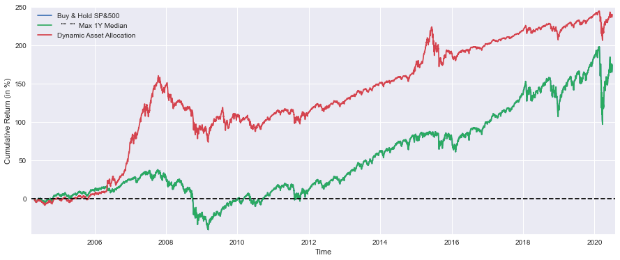 print('Median yearly excess return over SP500 =',round(float(DynAssAll1y.median()-SP1Y.median())*100,1),'%')Matplotlib provides a convenient tool for creating visual comparisons between various investment strategies via this code snippet. An area of 15 by 6 inches is set up and three time series representing cumulative returns are plotted: a Buy and Hold strategy based on the S&P 500, a Maximum 1-year Median Return strategy, and a Dynamic Asset Allocation strategy. In order to represent percentages, the values are multiplied by 100, and each line is appropriately labeled to show the percentage. X-axis is labeled Time, and Y-axis is labeled Cumulative Return in %, which improves the clarity of the figure. The plot includes an indication of the break-even point at y=0, as well as a horizontal dashed line at y=0 to indicate the break-even point, as well as a legend for the lines so they can be identified easily. As you can see, the graph is displayed using the plt.show() function.