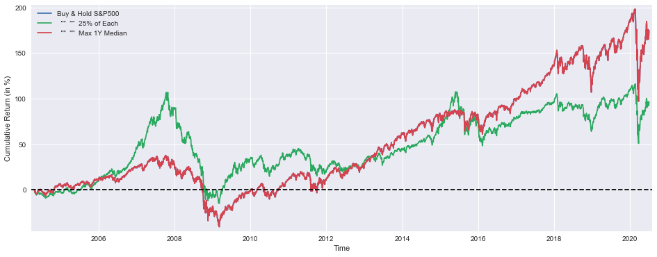 print('Median yearly excess return over SP500 =',round((mmBuyHold1yAll.median()-SP1Y.median())*100,1),'%')This code creates a plot that allows the user to visualize the cumulative returns of various investment strategies over the course of time compared to the S&P 500 index. The tool creates a figure of a given size and plots three strategies, namely the Buy and Hold strategy for the S&P 500, the portfolio strategy with an equal allocation of assets across the portfolio, and the maximum one-year median return strategy. Time is shown as the x-axis, while Cumulative Return in percentage is shown on the y-axis, which provides context for the data by providing a sense of time. For clarity purposes, the plot includes margins at the top and bottom to differentiate positive and negative returns, as well as a horizontal dashed line to represent the zero point. Each strategy is indicated by a legend at the bottom of the chart.